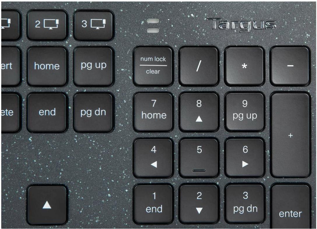 Die Targus Sustainable Energy Harvesting EcoSmart German-language Keyboard kombiniert Bluetooth und fortschrittliche Solartechnologien mit recycelten Materialien in einer umweltfreundlichen Tastatur in Standardgröße. Diese Tastatur wird aus bis zu 85 % recyceltem Material hergestellt und ist mit einem antimikrobiellen Schutz ausgestattet, um das Wachstum von Mikroorganismen zu verhindern und gleichzeitig die Umwelt zu schützen. Sie wird in erster Linie durch Solarzellen betrieben, die so optimiert sind, dass sie Licht aus einer Vielzahl von Lichtverhältnissen (einschließlich künstlicher Innenbeleuchtung) aufnehmen können, und kann über Bluetooth SoC mit bis zu drei Geräten verbunden werden, was bedeutet, dass sie dank ihres extrem niedrigen Stromverbrauchs drei- bis viermal stromsparender ist als andere Bluetooth-Tastaturen. Außerdem verfügt diese Tastatur über den antimikrobiellen Schutz DefenseGuard von Targus. Im Gegensatz zu örtlich aufgetragenen Sprays ist diese DefenseGuard-Tastatur mit antimikrobiellen Zusätzen versehen, die sich nicht abnutzen oder abwaschen lassen und während der gesamten Lebensdauer des Produkts kontinuierlich wirken.
