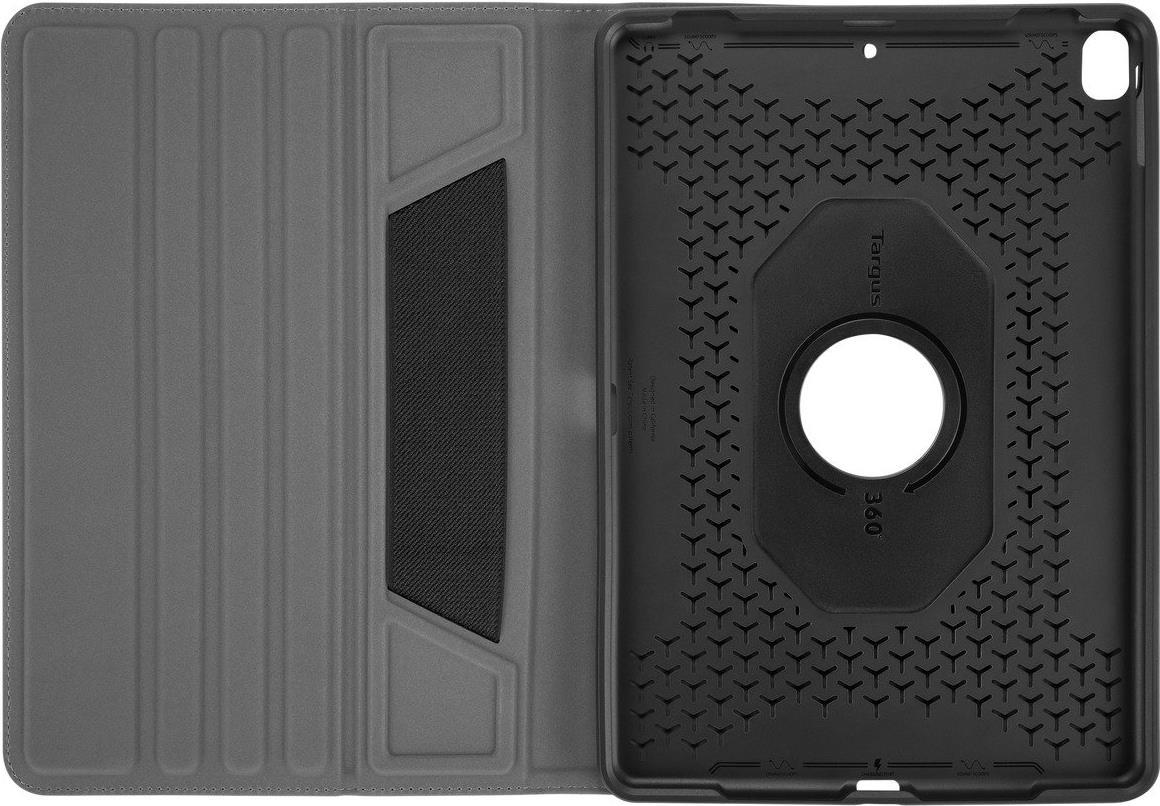 Die Targus Versavu Reihe ist zurück mit einer Hülle für das 10,5'' iPad Pro. Die drehbare, passgenaue Hartschale ermöglicht die Anzeige ohne Hände im Quer- und Hochformat und bietet Zugriff auf die iPad-Anschlüsse und die -Kamera. Die in der Hülle integrierten Audio-Vertiefungen rund um die Lautsprecher des Geräts verstärken die Tonausgabe nach vorne. Die Abdeckung hat eine weiche Innenverkleidung zum Schutz des Displays und tiefe Schaumstoffrillen für verschiedene Neigungswinkel zum Betrachten und Tippen. Dieses ikonische Hüllendesign zeigt das charakteristische iPad Apple-Logo auf der Rückseite Ihres Geräts bei Verwendung.