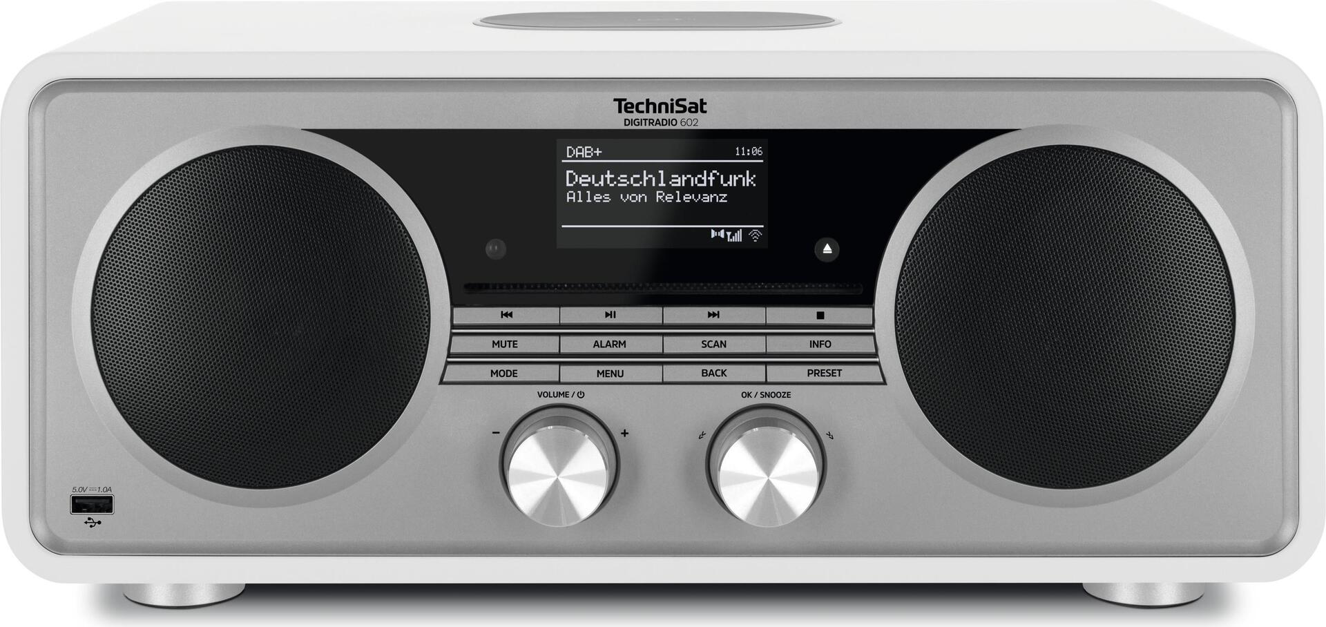 Vielseitig, mit mächtigem Sound: Das DIGITRADIO 602 ist das richtige Musiksystem für echte Musikfans. Denn ganz gleich, welchen Stil oder welche Wiedergabeoption Sie bevorzugen - Ihre Lieblingsmusik klingt klar und satt aus zwei 20-Watt-Lautsprechern, unterstützt von einem integrierten 30-Watt-Subwoofer. Das DIGITRADIO 602 übertrifft viele andere Stereoanlagen nicht nur in Sachen Klang. Neben DAB+ Digitalradio und UKW können Sie dank der integrierten WLAN-Funktionalität über 40.000 Internetradiosender weltweit empfangen. Um noch mehr Abwechslung zu genießen, können Sie auf Ihre CD-Sammlung zugreifen oder Ihre Lieblingsmusik über Spotify Connect sowie über Bluetooth von Ihrem mobilen Gerät abspielen. Und damit Ihr Smartphone beim Streaming nicht den Strom verliert, können Sie Ihr Qi-kompatibles Gerät direkt am DIGITRADIO 602 kabellos aufladen.Produkttext[/head]Vielseitig und mit gewaltigem Klang: Das DIGITRADIO 602 ist das richtige Musiksystem für aufrichtige Musikfans. Denn egal welche Stilrichtung oder Abspielmöglichkeit Sie bevorzugen – Ihre Lieblingsmusik ertönt klar und facettenreich aus zwei jeweils 20 Watt starken Lautsprechern, unterstützt von einem integrierten 30 Watt Subwoofer. Nicht nur in puncto Sound stellt das DIGITRADIO 602 viele Stereoanlagen in den Schatten. Neben DAB+ Digitalradio und UKW empfangen Sie dank der integrierten WLAN-Funktionalität über 40.000 Internetradio-Stationen weltweit. Zur Abwechslung greifen Sie auf Ihre CD-Sammlung zu oder spielen Ihre Lieblingsmusik von Ihrem mobilen Gerät via Bluetooth ab. Und damit Ihr Smartphone beim Musikstreaming nicht an Akkuleistung verliert, können Sie Ihr mit dem QI-Ladestandard kompatibles Gerät direkt auf dem DIGITRADIO 602 kabellos laden.DAB+ Digitalradio in perfekter Klangqualität.DAB+ Digitalradio ist rauschfreies Radio bei extrem robustem Empfang. Dem regional begrenzten UKW-Programmangebot setzt DAB+ viele bundesweit ausgestrahlte Radioprogramme in bester Digitalqualität entgegen. Hinzu kommen zahlreiche regional ausgestrahlte Sender.Grenzenlose Radiovielfalt aus dem Internet.Mit der integrierten Internetradio-Funktion greifen Sie auf tausende Internetradio-Sender zu. Verbinden Sie das Gerät hierzu mit dem Heimnetzwerk. Das Angebot wird kontinuierlich ausgebaut und automatisch aktualisiert, sodass Sie auch in Zukunft zahlreiche spannende Programme aus aller Welt entdecken können (benötigt Breitband-Internetanschluss).Kabelloses Aufladen Ihres Smartphones.Superpraktisch: Dieses Radio besitzt auf der Oberseite ein Ladefläche für Geräte mit QI-Ladestandard. Legen Sie Ihr kompatibles Smartphone einfach auf der Oberfläche ab, um das Gerät bequem kabellos aufzuladen.Hören Sie Ihre CD-Sammlung rauf und runter.Auf dem integrierten CD-Player können Sie sich Ihre komplette CD-Sammlung anhören. Der CD-Player unterstützt klassische Audio-CDs sowie die Formate CD-R und CD-RW. Darüber hinaus können Sie auch MP3-CDs abspielen.Spielt die Lieblingssongs vom SmartphoneÜber Bluetooth-Audiostreaming übertragen Sie Musik vom Smartphone, Tablet oder PC ohne Kabelverbindung und in bester Qualität auf das Gerät.TechniSat CONNECTTechniSat CONNECT ist die App, die erstmals die einheitliche Steuerung einer Vielzahl smarter Funktionen aus einer zentralen App heraus ermöglicht. Die App lässt sich dabei mit verschiedenen Anwendungsmodulen individuell auf Ihre Erfordernisse anpassen. CONNECT ist verfügbar für iOS- und Android-Mobilgeräte.Spotify Connect.Nutzen Sie die Spotify-App auf Ihrem Smartphone, Tablet oder PC, um Ihre Lieblingskünstler und die aktuellsten Hits auf Ihrem Radio oder über Lautsprecher abzuspielen. Die Nutzung von Spotify Connect ist bei diesem Gerät sowohl mit Spotify Premium wie auch Spotify Free möglich.Ganz klassisch Radio hören.Empfangen Sie klassische UKW-Radiostationen in Ihrem Empfangsbereich. Über RDS (Radio Data System) erhalten Sie zudem erweiterte Sendungsinformationen und alternative Zusatzfrequenzen zum gehörten UKW-Radiosender.UhrNeben Kanal- und weiteren Programminformationen können Sie auf dem integrierten Display auch die Uhrzeit anzeigen lassen. Die Uhrzeitinformationen werden auf elektronischem Wege mit den empfangenen Programmen übermittelt, so dass die korrekte Uhrzeit automatisch eingestellt wird.Wecker / SleeptimerDieses Gerät verfügt über praktische Sleeptimer mit zahlreichen einstellbaren Schaltzeiten. So können Sie den Abend gemütlich ausklingen lassen, ohne sich um das Ausschalten kümmern zu müssen. Über die integrierte Radio-Weckfunktion werden Sie auf Wunsch von Ihrer Lieblingssendung geweckt.Individuelle Klangeinstellungen.Steuern und regeln Sie Höhen und Bässe manuell, um eine individuelle und optimale Abmischung des Klangbildes zu erreichen.Ideal für Musiksammlungen auf USB-SticksSie haben unzählige MP3-Songs auf USB-Datenträgern (Festplatten oder Sticks) gespeichert? Dann schließen Sie den Datenträger über die USB-Schnittstelle an, um die Musik direkt auf dem Gerät abzuspielen.USB-ChargingSie können Geräte, wie z. B. Smartphones oder Musikplayer, die via USB aufgeladen werden, am USB-Anschluss dieses Geräts aufladen.[head]Hauptmerkmale