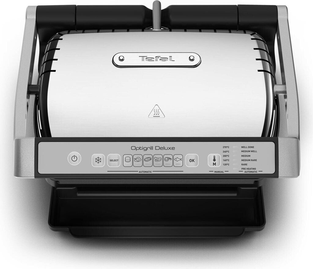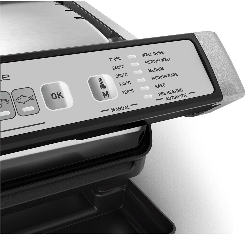 Der Tefal OptiGrill Deluxe GC707D ist der ideale Indoor-Kontaktgrill für perfekte Grillergebnisse. Mit patentierter Sensor-Technologie passt er sich automatisch an Dicke und Menge der Zutaten an und bietet 5 Garstufen von blutig bis durchgebraten. Sechs automatische Programme für Steak, Fisch, Burger, Hähnchen, Wurst und Sandwich/Panini sowie Modi für Tiefkühlkost und Gemüse sorgen für Vielseitigkeit. Die abnehmbaren, antihaftbeschichteten Druckguss-Aluminiumplatten mit Gitterstruktur und Fettauffangschale sind spülmaschinengeeignet für einfache Reinigung. Mit 2000 W Leistung grillen Sie effizient für bis zu 4 Personen.