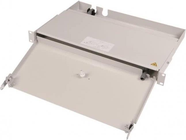 Das 19"-Gehäuse mit geschlossenem Schubladenauszug und mit Aufnahme für maximal 3 Spleiß- oder Kombikassetten ist mit integrierten Kabeleinführungsöffnungen links für 2 PG16-Verschraubungen und mit Führungen zur Faser- und Kabelablage, Schutzart IP 20 ausgestattet.