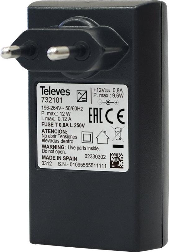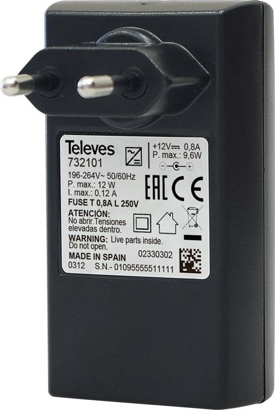 Televes MS-NT1208N. Eingangsspannung: 196-264, AC Eingangsfrequenz: 50/60, Ausgangsspannung: 12 V. Stromversorgung: Innenraum, Starkstromtyp: AC-an-DC, Schutzart (IP-Code): IP20. Produktfarbe: Schwarz. Breite: 47 mm, Tiefe: 84 mm, Höhe: 70 mm (732101)