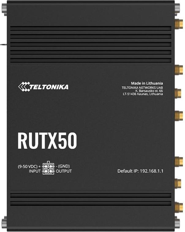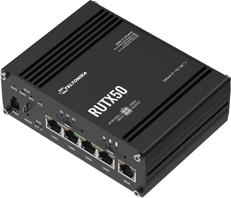 Teltonika RUTX50 Router, Netzwerkkabel (1,5 m), 2x WLAN-Antennen, 2x Mobilfunkantennen, GNSS-Antenne, 2x WLAN-Kabel (1,5 m), GPS-Kabel (3 m), Externer Netzadapter (EU), SIM-Kartenadapter-Kit[/Z3]