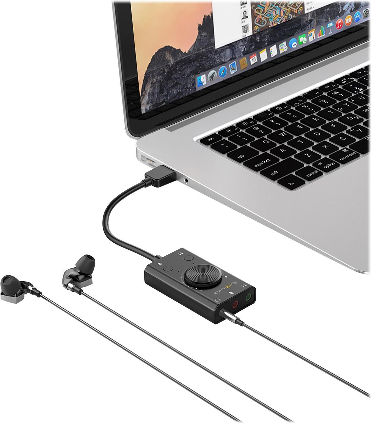 Dank der zwei Stereo-Ausgänge können gleich zwei Geräte gleichzeitig angeschlossen werden. Die Lautstärke wird direkt auf der Soundkarte eingestellt, während das USB 2.0 Kabel maximale Kompatibilität.