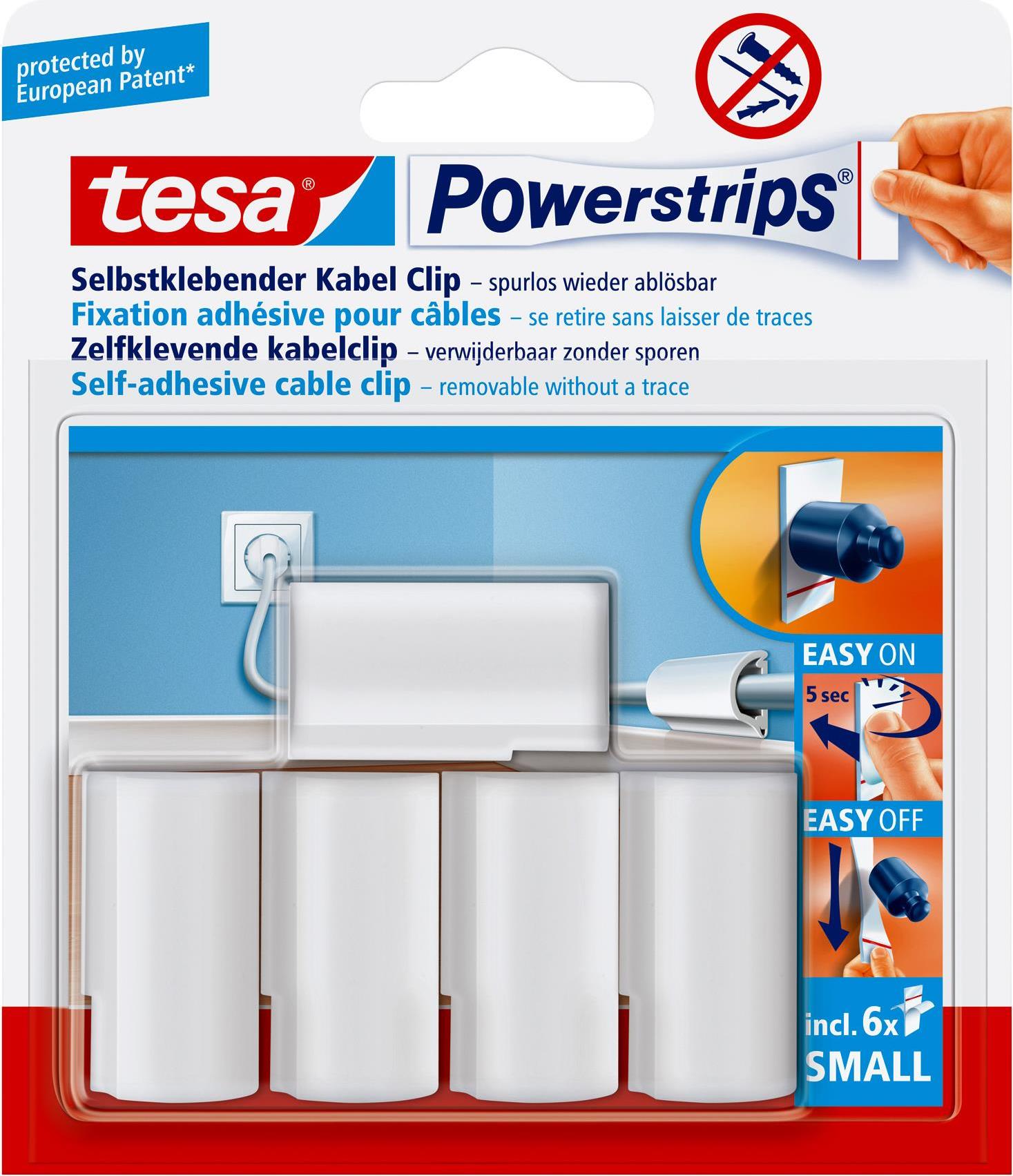 Der tesa Powerstrips® Kabel-Clip für das einfache Fixieren von Kabeln im Haushalt, Home Office und am Arbeitsplatz.Bringt Ordnung in den KabelsalatFixiert Kabel bis zu einem Durchmesser von 8 mm*Einfach anzubringen ohne Schrauben, Dübel oder NägelJederzeit spurlos wieder ablösbar** durch die tesa Powerstrips® TechnologieDer Kabel-Clip ist mit neuem tesa Powerstrips® Small mehrfach verwendbarDer Powerstrip® wird vom Kabel-Clip vollständig verdeckt*Nicht geeignet für Vinyltapeten, antihaftbeschichtete Oberflächen, Styropor®, Schaumstoff, poröse Materialen**Spurlos ablösbar von glatten, ausreichend festen Untergründen