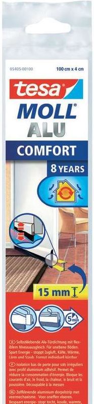 tesa Moll STANDARD Türdichtschiene, braun, 43 mm x 1 m Tür-Dichtung aus Kunststoff, für Textilböden, selbstklebend, für Spaltenbreiten bis 15 mm, mit elastischer Bürstenkante, stoppt Lärm, Staub, Zugluft und Kälte (05403-101-0 / alt: 05403-1-9)