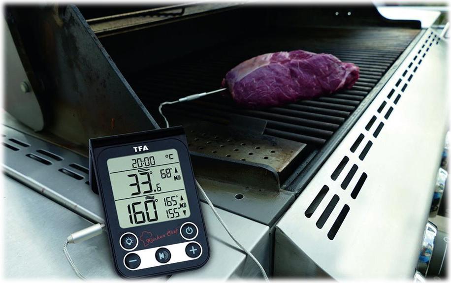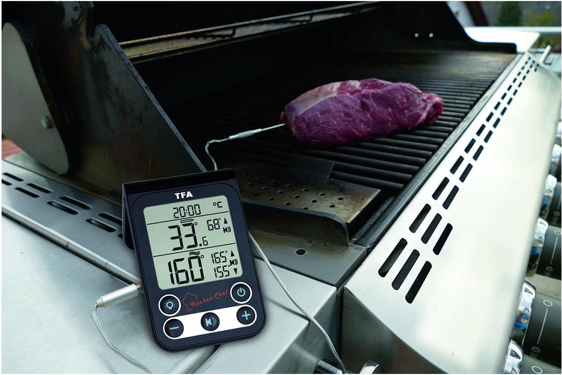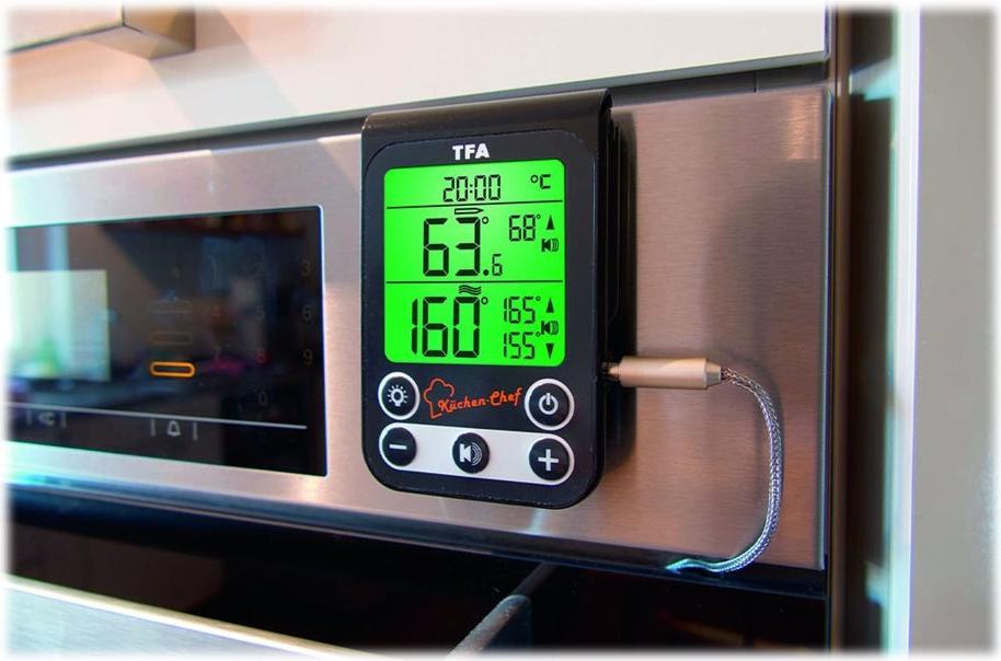 Die extra-dünne Fühlerspitze sorgt für eine schnelle Messung und schont die Fleischstruktur. Ist die gewünschte Kerntemperatur erreicht oder bleibt die Ofentemperatur nicht innerhalb der einprogrammierten Grenzwerte, werden Sie per Signalton darauf aufmerksam gemacht. Stellen oder hängen Sie das Gerät in Ofennähe auf. Das Gerät ist einfach zu bedienen und durch das hell beleuchtbare Display immer sehr gut ablesbar. Auch zum Garen bei Niedrigtemperaturen ist der Küchen-Chef hervorragend geeignet.