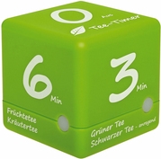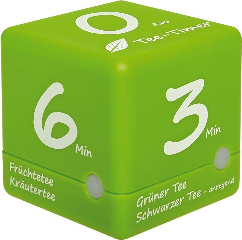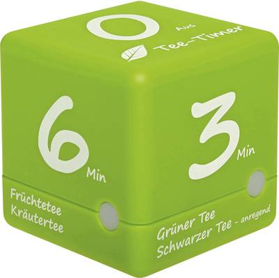 Möchten Sie eine perfekte Tasse Tee zubereiten, dann ist der Tee-Timer ein ideales Zubehör für Küche und Haushalt. Dieser Würfeltimer ist speziell für die Teezubereitung gedacht und lässt sich spielend leicht bedienen. Tee gilt nach Wasser als das weltweit beliebteste Getränk. Egal ob grüner Tee, schwarzer Tee, Früchtetee oder Kräutertee, mit dem TFA Tee-Timer gelingt Ihnen das leckere Heißgetränk.Die Anwendung des handlichen Tee-Timers ist durch das durchdachte Design sehr einfach: Die vier wichtigsten Ziehzeiten (3 - 4 - 5 - 6 Minuten) für Tee sind vorprogrammiert und auf der Würfeloberseite aufgedruckt. Einfach den Teebeutel oder losen Tee im Teefilter in die Tasse geben, die gewünschte Zeit am Tee-Timer wählen und nach oben drehen und der Timer läuft sofort. Das kleine Display dreht sich mit und zeigt die Countdown-Zeit. Die rote LED-Leuchte pulsiert.Ist die ausgewählte Zeit erreicht, blinkt die LED-Leuchte des Tee-Timers und ein Signalton erinnert daran, den Aufbrühvorgang zu beenden. Zum Beenden des Alarms wird der Tee-Timer auf die neutrale Seite gedreht. Bis dahin wird der Teeliebhaber über die bereits verstrichene Zeit informiert. Genießen Sie nun Ihren perfekt zubereiteten Tee!Je nach Anwendungssituation und persönlichen Vorlieben bei Ihrem Heißgetränk bietet der Tee-Timer viele Einstellmöglichkeiten: Der Alarmton lässt sich laut oder leise, ein- oder ganz abstellen. Die LED-Leuchte am Timer kann ebenfalls ausgeschaltet werden. Auf Wunsch kündigt ein Voralarm 10 Sekunden vorher das Erreichen der Ablaufzeit an.Die genaue Ziehzeit ist von der Teesorte und der Blattgröße abhängig. Zieht schwarzer Tee beispielsweise nur kurz, wirkt er - ähnlich wie Kaffee - anregend. Je länger schwarzer Tee zieht, desto beruhigender wirkt er. Grüner Tee soll mit einer längeren Ziehzeit entzündungshemmend wirken.