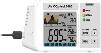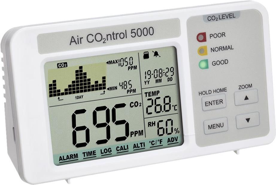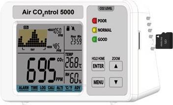 Der AirCO2ntrol 5000 ist ein CO2-Monitor mit Datenlogger-Funktion via SD-Karte. Neben dem CO2-Gehalt misst das Gerät die Temperatur und Luftfeuchtigkeit der Umgebung und informiert Sie über Datum und Uhrzeit.