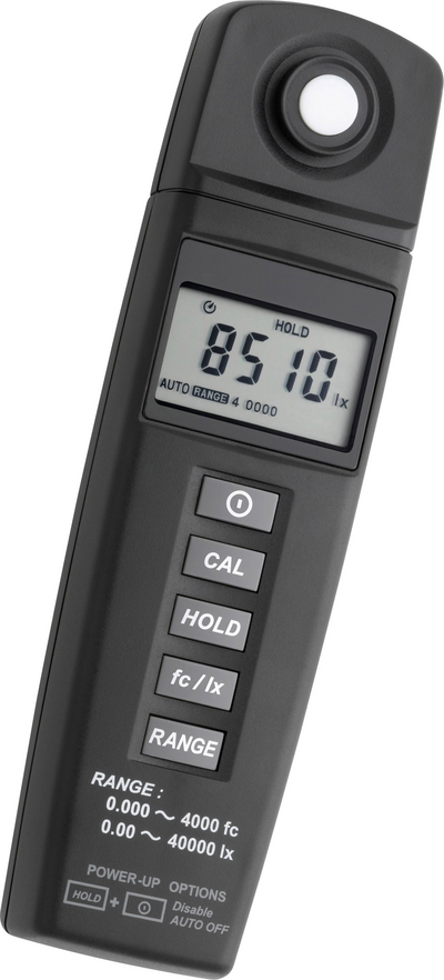 Zur Kontrolle der Lichtverhältnisse an Arbeitsplätzen, in öffentlichen Gebäuden, Industrie- und Wohngebäuden, Lagerhallen, Film- und Fotostudios, automatische und manuelle Bereichsumschaltung, HOLD Funktion, Messrate 2 mal pro Sekunde, automatische Nullpunkt-Kalibrierung, Messbereich 0,00...40.000 lx / 0,000…4000 fc, Auflösung 0,01 lx bzw. 0,001 fc, inkl. 9 V Blockbatterie.