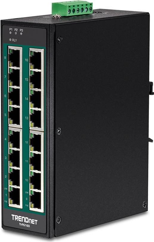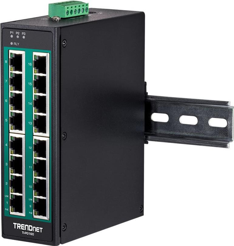 Der 16-Port industrielle Gigabit PoE+ DIN-Rail Switch von TRENDnet, Modell TI-PG160, verfügt über sechzehn Gigabit PoE+ Ports mit einer PoE-Gesamtleistung in Höhe von 240 Watt. Benutzer können sechzehn PoE+-Geräte an den industriellen PoE-Switch anschließen und verfügen gleichzeitig über zwei Gigabit-Ports für zusätzliche Netzwerkverbindungen. Der industrielle PoE-Switch ist mit einem Metallgehäuse nach IP30 ausgestattet, das einem hohen Grad an Vibration und Schock standhält und in einem weiten Temperaturbereich von -40° bis 75 °C (-40° bis 167 °F) für industrielle Umgebungen eingesetzt werden kann.