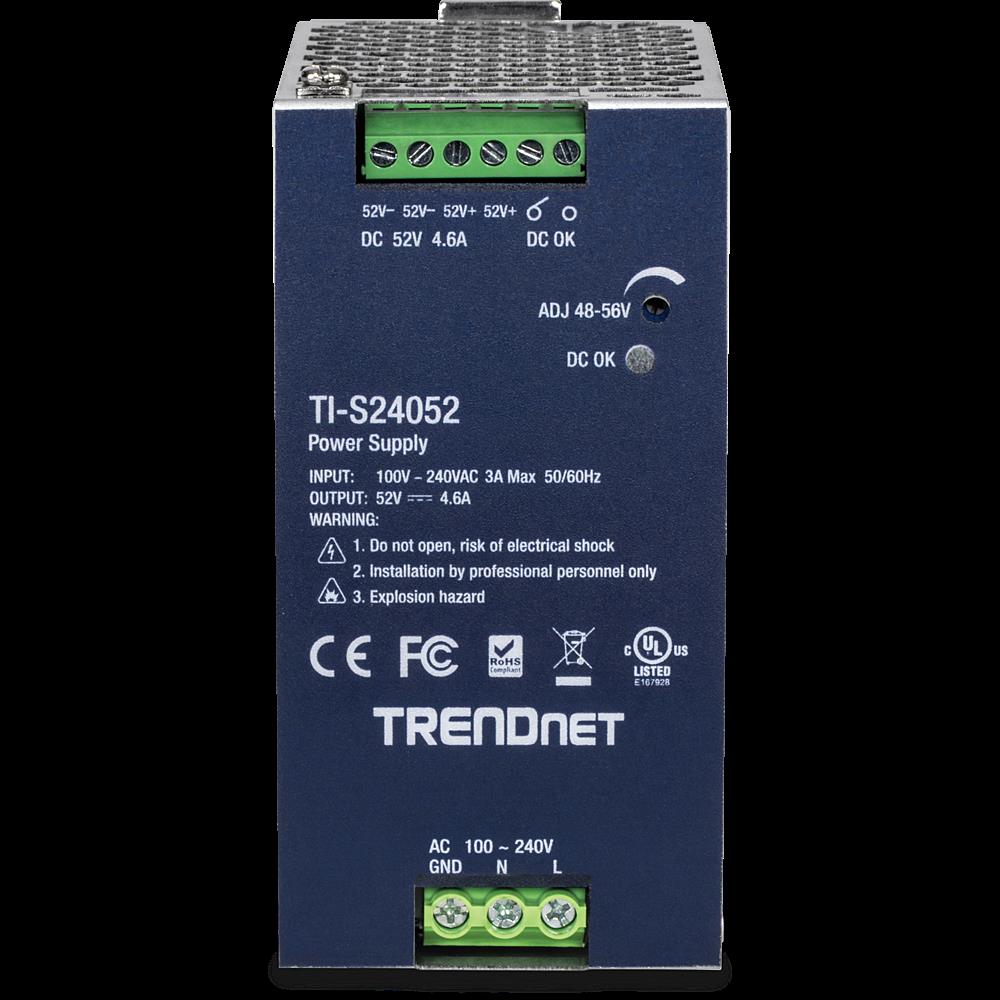 Das industrielle DIN-Schienen-Netzteil AC/DC mit PFC-Funktion von TRENDnet, Modell TI-S24052, liefert bis zu 240 W (52 V DC, 4,61 A) Strom für industrielle Geräte wie PoE-Switches, Injektoren und Wi-Fi-Zugangspunkte. Dieses Industrienetzteil unterstützt aktive PFC, um unbrauchbare Blindleistung zu eliminieren, und ist mit einer integrierten DIN-Schienenhalterung ausgestattet. Es unterstützt außerdem Schutzfunktionen für Überlast, Kurzschluss, Überspannung, Überstrom und Übertemperatur. Das Industrienetzteil ist für industrielle Umgebungen mit einem Betriebstemperaturbereich von -25° bis 70°C (-13° bis 158°F) ausgelegt.