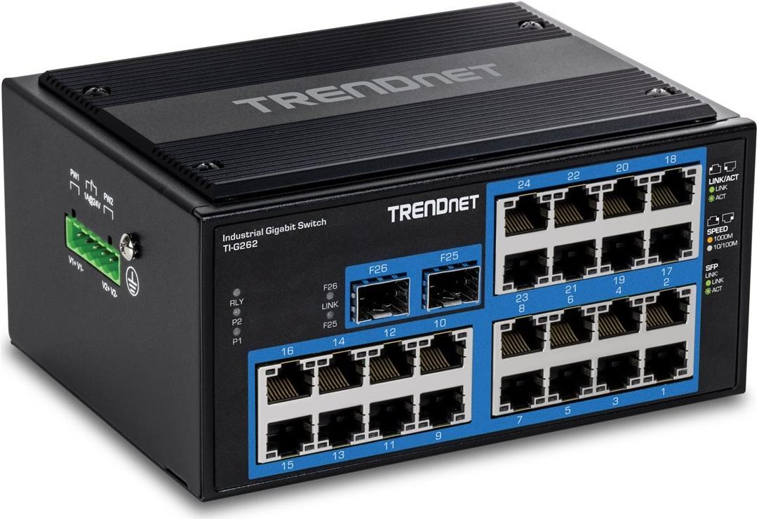 Der TRENDnet TI-G262 ist ein Switch in Industriequalität, der für Hochleistungsnetzwerke in anspruchsvollen Umgebungen entwickelt wurde. Mit einer Schaltkapazität von 52 Gbps und einer Weiterleitungsleistung von 38,69 Mpps unterstützt dieser Switch Gigabit-Ethernet mit 24 Ports und gewährleistet so eine zuverlässige und effiziente Datenübertragung. Das Gerät verfügt über ein gehärtetes Design, das in extremen Temperaturen von -40 °C bis 75 °C betrieben werden kann, und ist mit verschiedenen Standards, einschließlich IEC und FCC, kompatibel, wodurch es für verschiedene Anwendungen geeignet ist.