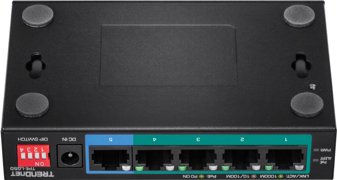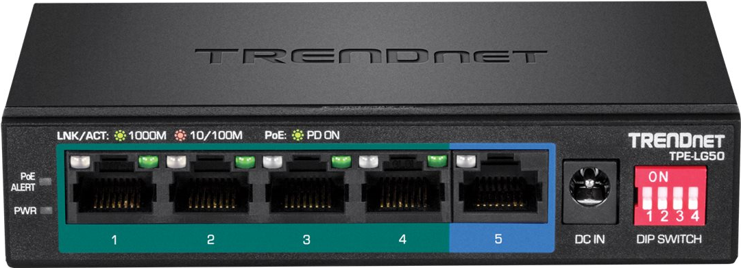 5-Port Gigabit Langstrecken-PoE+ Switch Der 5-Port Gigabit Long Range PoE+ Switch von TRENDnet, Modell TPE-LG50, liefert Daten und Strom über bestehende Ethernet-Kabel an Power over Ethernet (PoE) Geräte wie Access Points, VoIP-Telefone und IP-Kameras. Er unterstützt sowohl PoE (802.3af) als auch PoE+ (802.3at) Geräte mit einer PoE-Gesamtleistung in Höhe von 32 Watt. Aktivieren Sie den DIP-Schalter, um das PoE+-Signal auf bis zu 200m (656 Fuß) bei 10 Mbit/s für PoE-Installationen über große Entfernungen zu erweitern. Dieser robuste Metall-Switch sorgt für eine zuverlässige Hochgeschwindigkeits-PoE-Vernetzung. Sein lüfterloses Design ist perfekt für leise Umgebungen, die einen geräuscharmen Betrieb erfordern. PoE+ Power Eine PoE-Gesamtleistung in Höhe von 32 Watt versorgt bis zu vier Power over Ethernet Geräte mit Strom. Gigabit Fünf Gigabit-Ports bieten eine Schaltkapazität in Höhe von 10 Gbit/s zur Unterstützung von Edge-Netzwerkinstallationen. PoE+ Langstrecken-Switch Aktivieren Sie den DIP-Schalter, um das PoE+-Signal auf bis zu 200m (656 Fuß) bei 10 Mbit/s.
