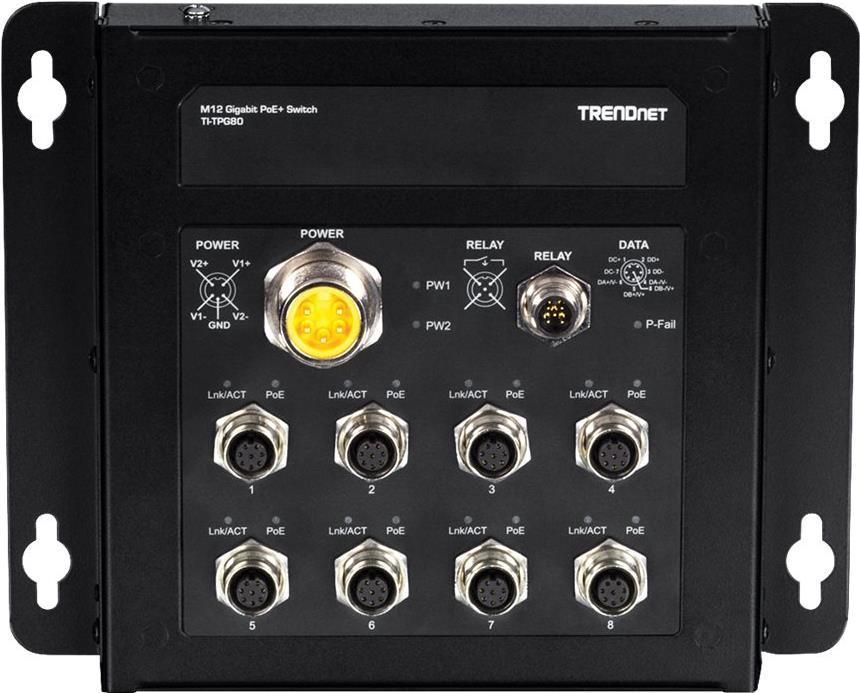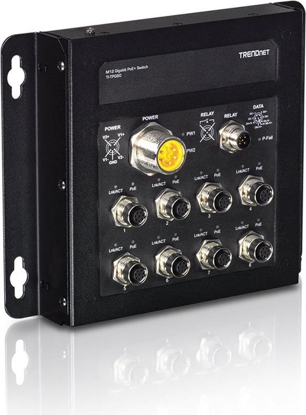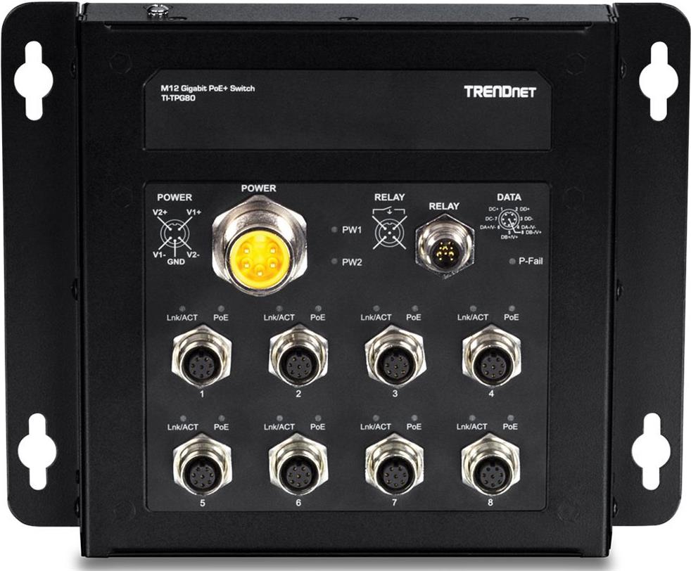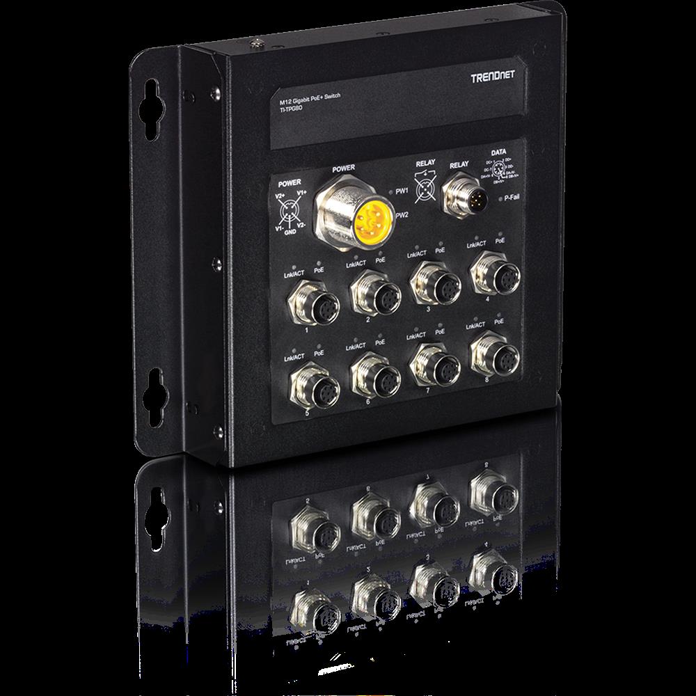 Der 8-Port industrielle EN50155 M12 Gigabit PoE+ Railway Switch von TRENDnet, Modell TI-TPG80, verfügt über acht M12 Gigabit PoE+ Ports mit einer PoE-Gesamtleistung bis zu 200 Watt. Dieser M12 Railway Switch ist mit einem Metallgehäuse mit Schutzklasse IP40 ausgestattet, das einem hohen Grad an Vibration und Schock standhält und in einem weiten Temperaturbereich von -40° - 75° C (-40° - 167° F) für industrielle EN50155-Anwendungen eingesetzt wird. Dieser industrielle M12-Schalter unterstützt einen Eingangsspannungsbereich von 24 - 56V DC mit M23-Leistungsschnittstelle und M12-Alarmrelaisschnittstellen für mobile Bus-, Bahn- und andere Fahrzeuganwendungen. Entwickelt und getestet für Transport- und Telekommunikationsanwendungen.