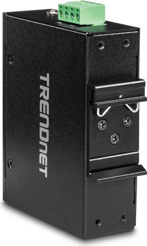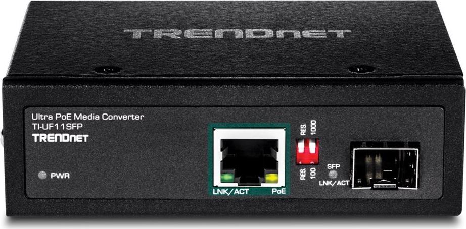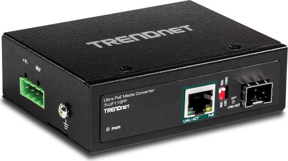 Der industrielle SFP-zu-Gigabit UPoE Medienkonverter von TRENDnet, Modell TI-UF11SFP, konvertiert Glasfaser zu Kupfer und liefert gleichzeitig Strom an PoE, PoE+ und UPoE kompatible Geräte wie zum Beispiel IP-Kameras, VoIP-Telefone und Wireless Access Points. Das gehärtete Gehäuse mit Schutzklasse IP30 ist für industrielle Umgebungen geeignet. Dual redundante Stromversorgungen (Stromversorgung separat erhältlich: TI-S12048) mit Überlastschutz minimieren Ausfallzeiten.
