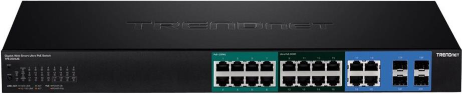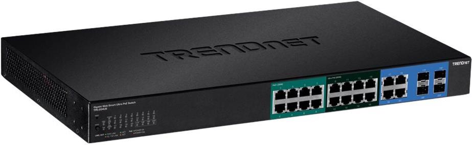 20-Port Gigabit Web Smart Ultra PoE Switch Der 20-Port Gigabit Web Smart Ultra PoE Switch von TRENDnet, Modell TPE-204US, bietet fortschrittliche Kameraverwaltungsfunktionen mit einer Gesamtschaltkapazität in Höhe von 40 Gbit/s. Dieser rackmontierbare IPv6-fähige Switch verfügt über eine intuitive, webbasierte Oberfläche. Fortschrittliche Verkehrsmanagement-Kontrollen mit SNMP-Überwachung machen dieses Gerät zu einer leistungsstarken Lösung für SMB-Netzwerke. Der TPE-204US bietet acht Gigabit-UPoE-Ports und acht Gigabit-PoE+-Ports mit einer Gesamtleistung von 370 Watt sowie vier Shared Gigabit-Ports (RJ-45 oder SFP). Der UPoE Standard liefert bis zu 60 Watt Leistung pro Port für Geräte wie z.B. High Power Wireless Access Points, PTZ (Schwenk-/Neige-/Zoom-) IP-Kameras und VoIP-Telefonie-Systeme. Web Smart Verwaltung Bietet eine benutzerfreundliche, webbasierte Verwaltungsoberfläche zur Reduzierung der Komplexität der Switch-Konfiguration und bietet eine Kombination von SMB-Verwaltungsfunktionen für eine einfache Bereitstellung. Flexible Integration Verwaltete Funktionen beinhalten Zugriffskontrolllisten, VLAN, IGMP Snooping, QoS, RMON, SNMP Trap und Syslog zur Überwachung und flexiblen Netzwerkintegration. UPoE Power Gesamtleistung in Höhe von 370 Watt PoE versorgt PoE/PoE+/UPoE Geräte mit Strom.