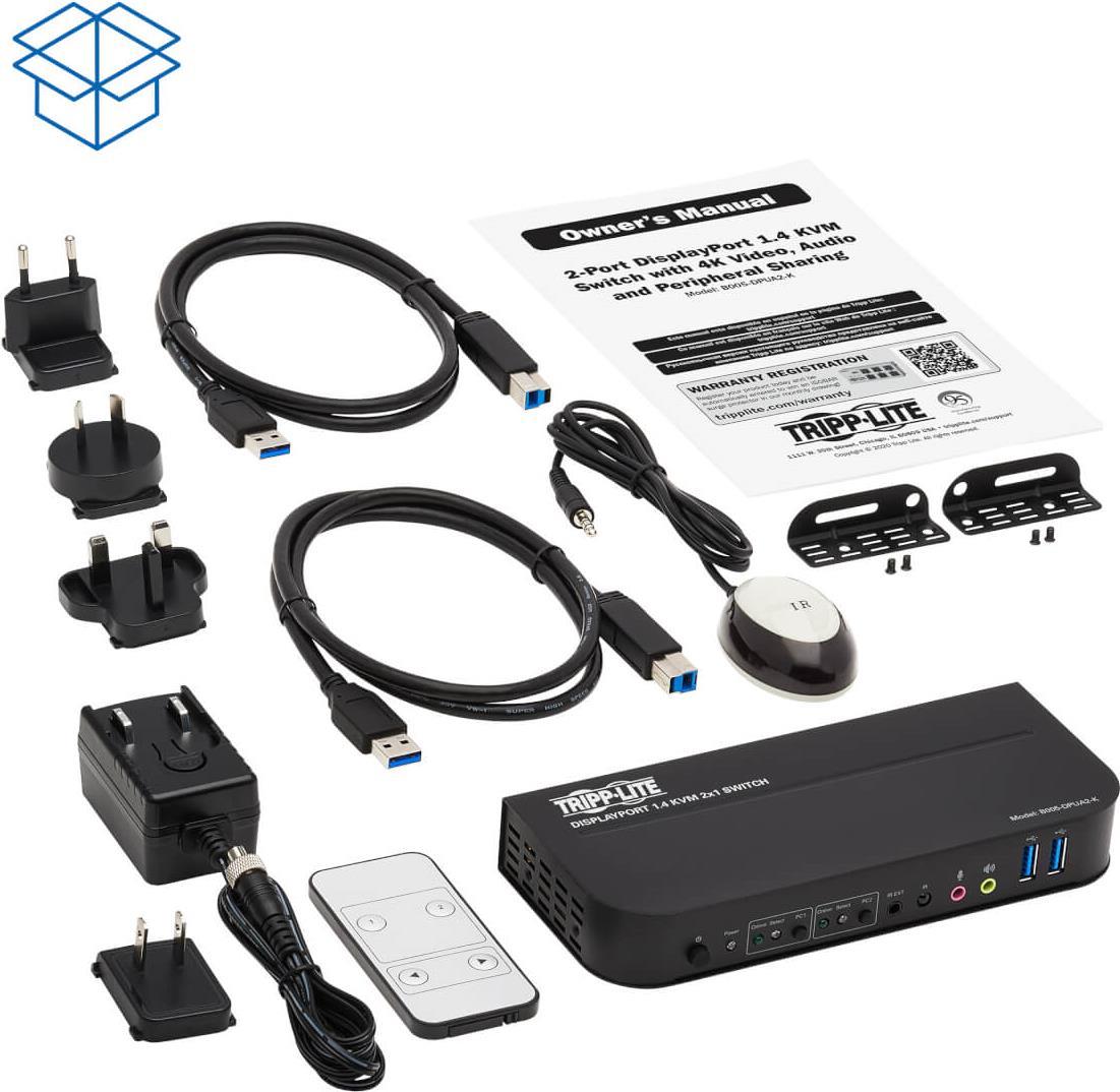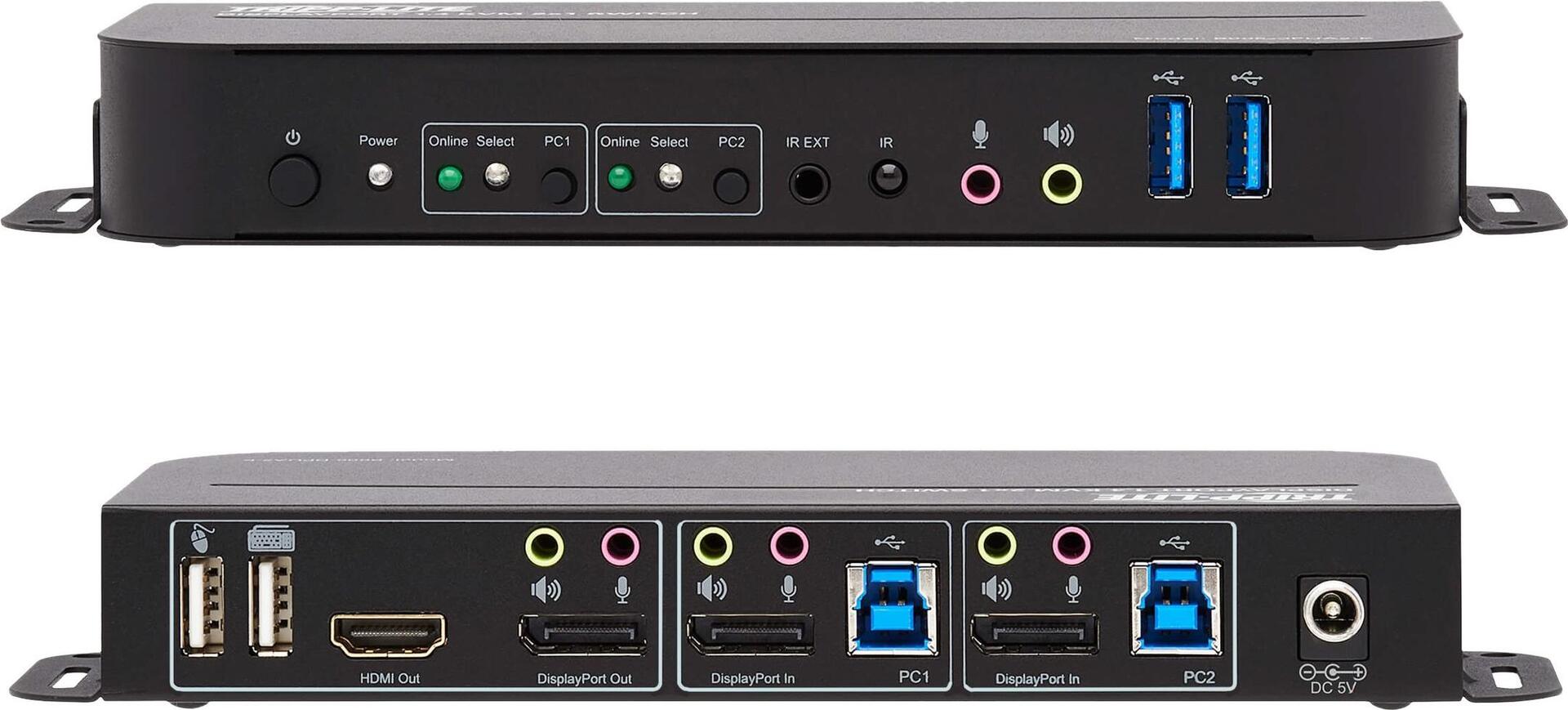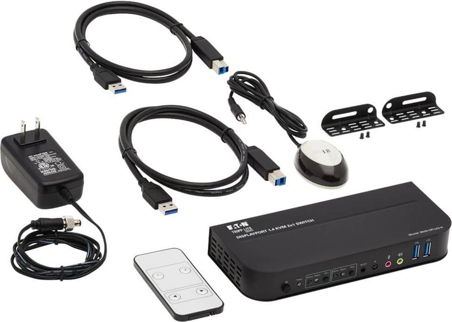 Der DisplayPort-USB-KVM-Switch von Eaton Tripp Lite wurde entwickelt, um die Verwaltung mehrerer Geräte mit Leichtigkeit zu rationalisieren. Durch die Unterstützung von 4K 60Hz HDR können Nutzer eine hochwertige Bildqualität genießen, wodurch er sich für professionelle Grafiker, Videobearbeiter und alle, die hochauflösende Displays benötigen, eignet. Dieser KVM-Switch vereinfacht den Arbeitsplatz, indem er die Steuerung von zwei Computern über ein einziges Set aus Tastatur, Maus und Monitor ermöglicht und eine Vielzahl von Anschlussmöglichkeiten bietet, darunter DisplayPort-, HDMI- und USB 3.0-Anschlüsse, die die Kompatibilität mit einer Vielzahl von Geräten gewährleisten.Funktionen wie 36-Bit Deep Color, 3D-Unterstützung und 7.1-Kanal-Audiounterstützung verbessern das Multimedia-Erlebnis und machen es für Spiele, Unterhaltung und professionelle Anwendungen geeignet. Das Design gewährleistet eine zuverlässige Leistung unter verschiedenen Umgebungsbedingungen und macht ihn zu einer vielseitigen Wahl für jede Umgebung. Ob bei der Arbeit oder in der Freizeit - der DisplayPort-USB-KVM-Switch von Eaton Tripp Lite erfüllt die Anforderungen von Anwendern, die Wert auf Leistung, Flexibilität und Qualität legen.Produkttext[/head]Verbindet zwei DisplayPort-fähige Geräte mit einem einzigen Monitor, einer Tastatur und einer MausMit diesem KVM-Switch können Sie zwei Computer mit DisplayPort-Anschlüssen aufrufen, steuern, starten und neu starten und zwischen den Computern wechseln. Neben Desktop- und Notebook-Computern verbindet der Switch auch bis zu zwei Medien Center, Videospielsysteme, Blu-ray- und DVD-Player, Kabel- und Satellitenboxen, DVRs und andere DisplayPort-fähige Geräte. Beide Computer teilen sich einen Monitor, eine USB-Tastatur und eine USB-Maus, was Platz auf Ihrem Schreibtisch oder Ihrer Arbeitsfläche spart.Unterstützt DisplayPort++ für den Anschluss eines HDMI- oder DisplayPort-MonitorsDa der B005-DPUA2-K DP++ unterstützt, können eingehende DisplayPort-Signale in HDMI umgewandelt werden. Er verfügt über einen DisplayPort-Ausgang und einen HDMI-Ausgang, aber es kann nur jeweils ein Monitor verwendet werden.Das Umschalten zwischen den Computern geht schnell und einfach vonstattenVerwenden Sie die Drucktasten auf der Vorderseite, Hotkey-Befehle, Mausbewegungen oder die im Lieferumfang enthaltene IR-Fernbedienung für ein schnelles und einfaches Umschalten zwischen Computern. Sie können auch die automatische Scan-Funktion verwenden, um alle angeschlossenen Computer in Abständen von fünf Sekunden automatisch zu scannen. LEDs zeigen an, welcher Computer gerade ausgewählt ist.USB-Kabel sind für eine einfache Einrichtung im Lieferumfang enthaltenVerwenden Sie die im Lieferumfang enthaltenen USB 3.0-Kabel, um Ihre Computer an den KVM-Switch anzuschließen. Das Plug-and-Play-Gerät B005-DPUA2-K benötigt keine Treiber, so dass Sie es sofort anschließen und verwenden können. Es funktioniert mit allen gängigen Betriebssystemen, einschließlich Windows, macOS und Linux.Mit dem USB-Hub können Sie Peripheriegeräte gemeinsam von mehreren Computern aus nutzenZwei USB 3.0-Anschlüsse ermöglichen die gemeinsame Nutzung von USB-Peripheriegeräten, beispielsweise Drucker, Festplatten, Scanner, Webcams und Flash-Laufwerke, über die beiden angeschlossenen Computern. Die Anschlüsse unterstützen USB 3.0-Datenübertragungsgeschwindigkeiten bis zu 5 Gbit/s und sind abwärtskompatibel mit früheren USB-Generationen.Überträgt kristallklares True 4K-Video mit HDR und 4:4:4 FarbeDer B005-DPUA2-K unterstützt Ultra HD-Auflösungen bis zu 4096 x 2160 (4K x 2K) bei 60 Hz sowie HDR-Video und bietet eine große Auswahl an lebhaften Farben mit reicherem Kontrast, helleren Weißtönen und tieferen Schwarztönen auf Ihrem 4K-Display. Die HDCP 2.2-Konformität ermöglicht Ihnen das Streamen von 4K Amazon- und Netflix-Inhalten ohne Komplikationen. Dieser KVM-Switch unterstützt auch eine 4:4:4-Farb-Unterabtastung für PC-Spiele mit höchsten Grafikansprüchen oder für die Verwendung Ihres HDTV als PC-Monitor.Für eine praktische Montage mit den im Lieferumfang enthaltenen Halterungen ausgelegtDas robuste Metallgehäuse wird mit Montagehalterungen für die dauerhafte Installation an einer Wand oder unter einem Schreibtisch mit vom Benutzer bereitgestellten Hardware geliefert. Das im Lieferumfang enthaltene DC-Netzteil kann an jede Standard-Wechselstromquelle angeschlossen werden.[head]Hauptmerkmale