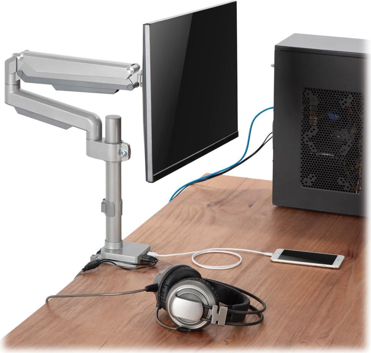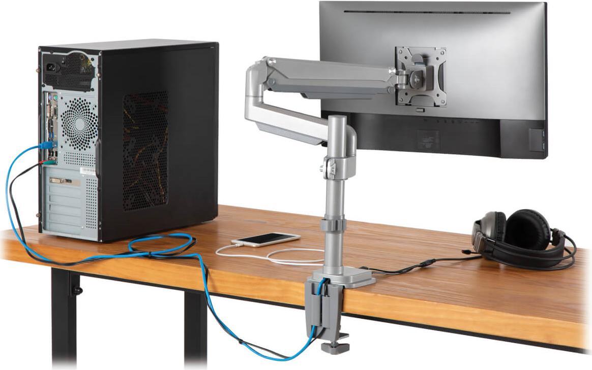 Die Eaton Tripp Lite Series Single-Display Flex-Arm Desktop Clamp wurde für diejenigen entwickelt, die eine flexible und anpassbare Lösung für ihre Bildschirmaufstellung suchen. Sie unterstützt Bildschirme von 17 Zoll bis 32 Zoll und gewährleistet so die Kompatibilität mit einer Vielzahl von Bildschirmen. Die aus robustem Aluminium und Stahl gefertigte Halterung ist voll beweglich und ermöglicht eine Neigung von -90° bis 90° sowie eine Drehung um 90° für optimale Betrachtungswinkel. Das integrierte Kabelmanagement sorgt für einen aufgeräumten Arbeitsplatz, während die zusätzlichen USB 3.0- und Audio-Anschlüsse die Anschlussmöglichkeiten erweitern.