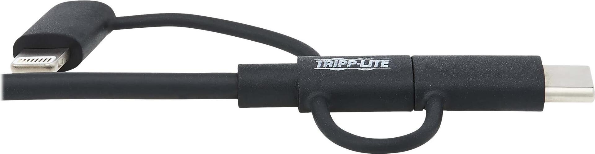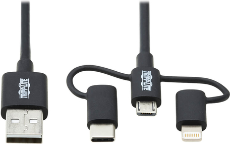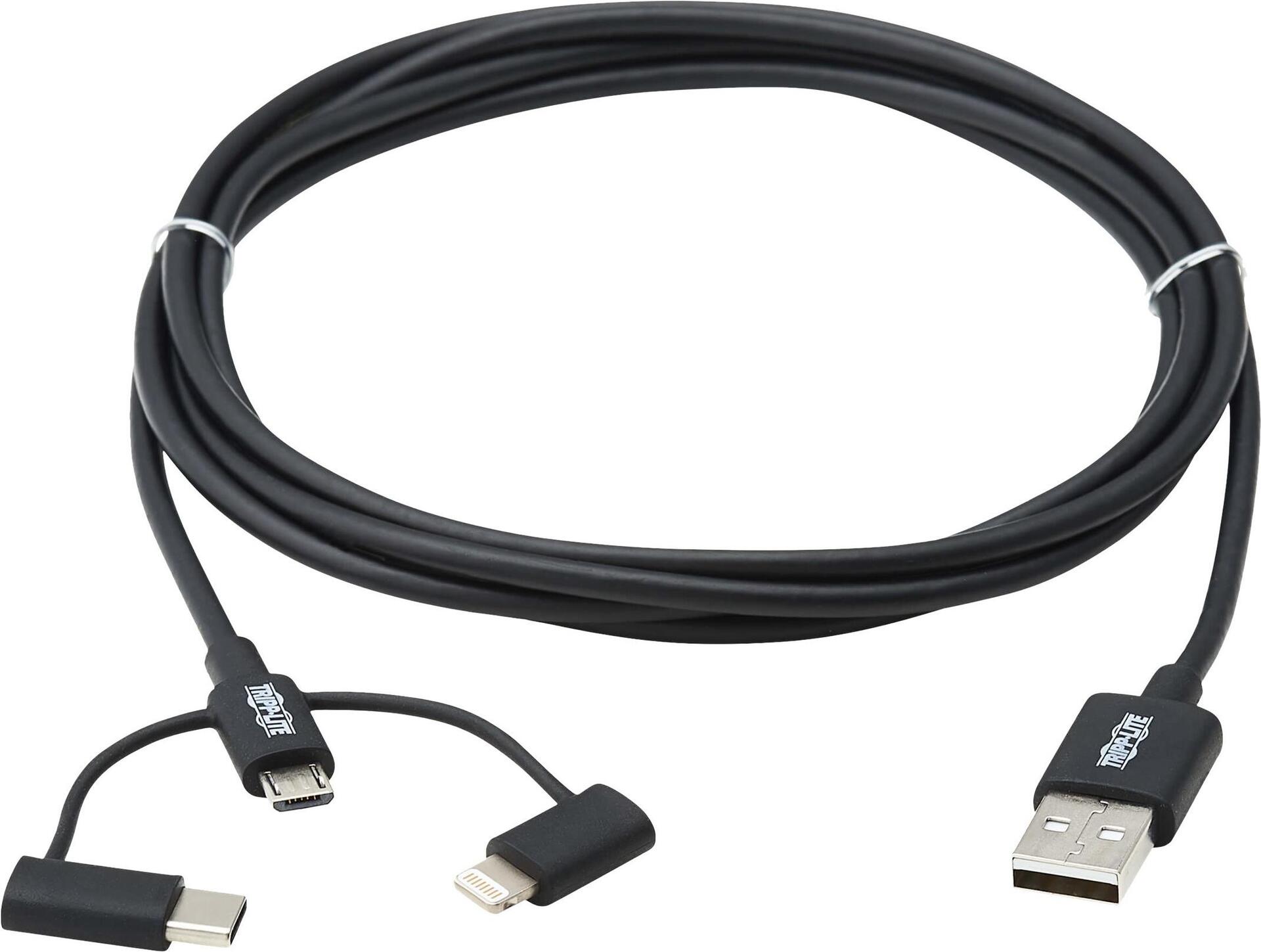 | Produktbeschreibung | Eaton Tripp Lite Series Universal USB-A to Lightning, USB Micro-B and USB-C Sync/Charge Cable (M/3xM), MFi Certified, Black, 6 ft. (1.8 m) - Lightning-Kabel - Lightning / USB 2.0 - 1.8 m |