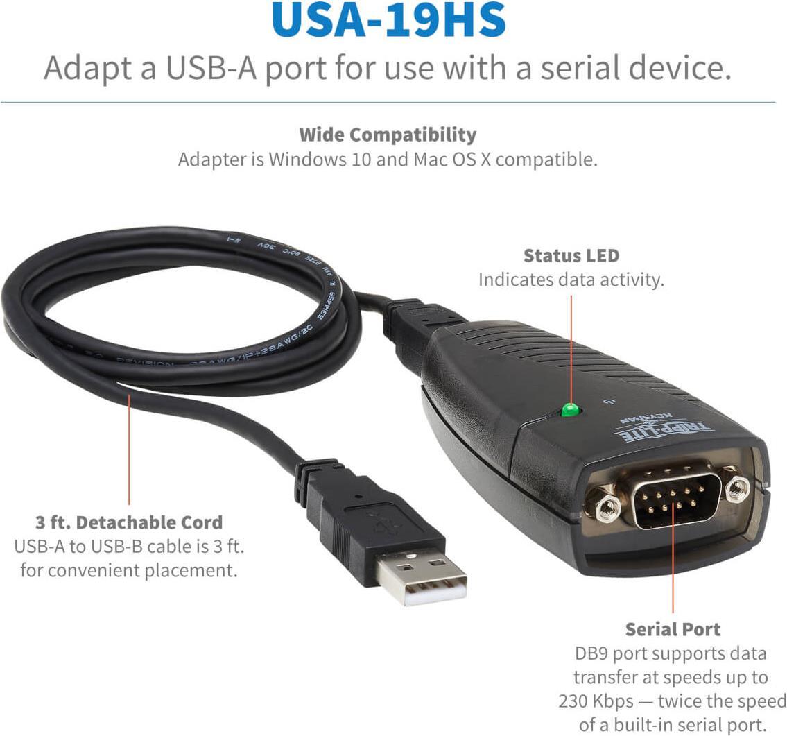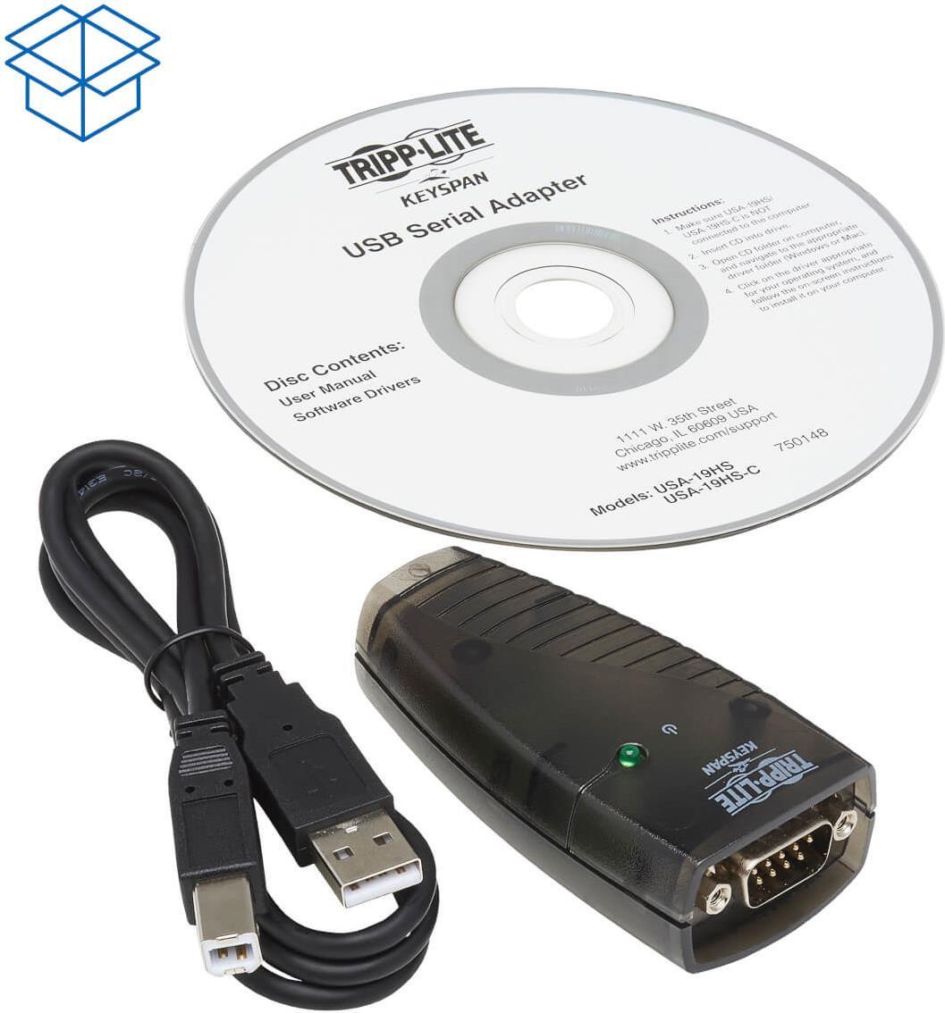 Der Tripp Lite Keyspan High Speed USB to Serial Adapter ist ein unverzichtbares Werkzeug für den Anschluss serieller Geräte an moderne Computer. Dieser Adapter verfügt über ein 91,4 cm langes USB-A-auf-USB-B-Kabel, das eine einfache und zuverlässige Verbindung ermöglicht. Durch die Unterstützung von Datenübertragungsraten von bis zu 230 Kbps gewährleistet er eine effiziente Kommunikation zwischen Geräten. Er wurde für eine breite Kompatibilität entwickelt und funktioniert nahtlos sowohl mit Mac- als auch mit PC-Plattformen und ist für Windows Vista zertifiziert, was eine reibungslose Integration in Ihre bestehende Einrichtung gewährleistet. Sein externer Formfaktor ermöglicht eine Plug-and-Play-Installation und macht ihn zu einer benutzerfreundlichen Lösung für den Zugriff auf serielle Schnittstellen moderner Computer. Ob Sie nun industrielle Geräte, Netzwerkausrüstung oder wissenschaftliche Instrumente anschließen, dieser Adapter bietet eine zuverlässige Brücke zu Ihren älteren Geräten.Produkttext[/head]Mit dem Keyspan RS-232-zu-USB-Adapter von Tripp Lite können Sie ein 9-poliges serielles Gerät an einen Computer oder Laptop mit einem USB-A-Anschluss anschließen. Der USA-19HS wird von den Herstellern serieller Geräte weitgehend empfohlen und wird an Switches, Router, Barcode-Scanner, GPS-Einheiten, Point-of-Sale-Geräte, Laborgeräte, Netzwerkspeichergeräte und andere Geräte mit einem 9-poligen seriellen Anschluss angeschlossen. Das mitgelieferte abnehmbare 1-m-Kabel unterstützt Datenübertragungsgeschwindigkeiten von bis zu 230 Kbit/s – doppelt so schnell wie eine integrierte serielle Schnittstelle. Der USA-19HS passt zu jedem USB-C-Kabel bis zu 5 m. Eine LED zeigt die Datenaktivität an. Dieser Adapter benötigt keine externe Stromversorgung und lässt sich bei nur 56 g leicht in Ihrer Laptoptasche verstauen und kann unterwegs verwendet werden. Windows Line Monitor und eine Software zur Datenverfolgung sind im Lieferumfang enthalten. Einfaches Upgrade mit kostenlosen Software-Downloads. Funktioniert mit Windows (bis zu 10) und Mac OS X (bis zu und einschließlich Mac OS Big Sur 11.4). Entspricht dem Federal Trade Agreements Act (TAA) für Käufe nach der GSA-Liste.Funktioniert mit seriellen RS-232-GerätenAnschluss an Switches, Router, Strichcode-Scanner, GPS-Einheiten, Point-of-Sale-Geräte, Laborgeräte, Netzwerkspeichergeräte, Modems, Grafiktablets und andere Geräte mit einem seriellen DB9-AnschlussUnterstützt Datenübertragungsgeschwindigkeiten von bis zu 230 Kbit/s – doppelt so schnell wie eine integrierte serielle Schnittstelle.Einfach einzurichten und zu verwendenKeine externe Stromversorgung erforderlichWiegt weniger als 57 Gramm für den bequemen Transport in Ihrem Rucksack oder in Ihrer LaptoptascheEin abnehmbares 0,91 m langes USB-A-Kabel ist im Lieferumfang enthaltenFunktioniert mit jedem USB-Kabel mit einer Länge von bis zu 4,88 mKompatibel mit den meisten SystemenFunktioniert mit Microsoft Windows (bis zu Windows 10) und Mac OS X (bis zu Mac OS Big Sur 11.4) sowie Apple Sandbox-AnwendungenErweiterbar mit kostenlosen Software-DownloadsWindows Netzmonitor und eine Software zur Datenverfolgung sind im Lieferumfang enthalten.Unterstützt sowohl 32-Bit- als auch 64-Bit-SystemeDer neue Treiber ermöglicht die Kompatibilität mit Mac OS Big Sur 11.4TAA-konformEntspricht dem Federal Trade Agreements Act (TAA) für Käufe nach der GSA-Liste[head]Hauptmerkmale