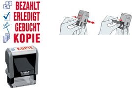 trodat Textstempelautomat ECO Printy Office 4912 \"GEBUCHT ------------------ für den Markt: D / L / A / CH ----------- Abdruckgröße: 42 x 12 mm, selbstfärbend, zweifarbiges Stempelkissen: blau/rot, Text in rot, Graphik in blau, Gehäusefarbe: grau, aus 75% recyceltem Material, passendes passendes Ersatzstempelkissen: 6/4912/2 (51 4912112)