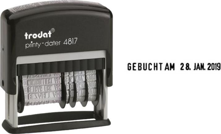 trodat Wortbandstempel Printy Dater 4817, mit Datum, schwarz Abdruckmaße: 4 x 46 mm, selbstfärbend, mit 12 Texten: GEFAXT, PER E-MAIL, TELEFONIERT, EINGEGANGEN, BESTELLT, ERLEDIGT, GEBUCHT, BEZAHLT, BETRAG ERH., KONTROLLIERT, VERSENDET, FAKTURIERT (WEDO: 51 4817/trodat: 4817)