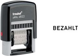 trodat Wortbandstempel Printy 4822, ohne Datum, schwarz ------------------ für den Markt: D / L / A / CH ----------- Abdruckmaße: 4 x 29 mm, selbstfärbend, mit 12 Texten: BEZAHLT, PÄCKCHEN, EINSCHREIBEN, ERLEDIGT, UNGÜLTIG, BEANTWORTET, INFOPOST, ZUR VERRECHNUNG, KOPIE, GEBUCHT, DRINGEND, BETRAG ERHALTEN (WEDO:51 4822/trodat: 4822)