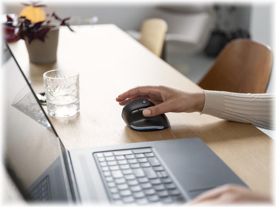 Wiederaufladbare ergonomische Funkmaus mit Beleuchtung und einem ergonomischen, vertikalen Design, das die Beanspruchung von Arm und Handgelenk reduziert.