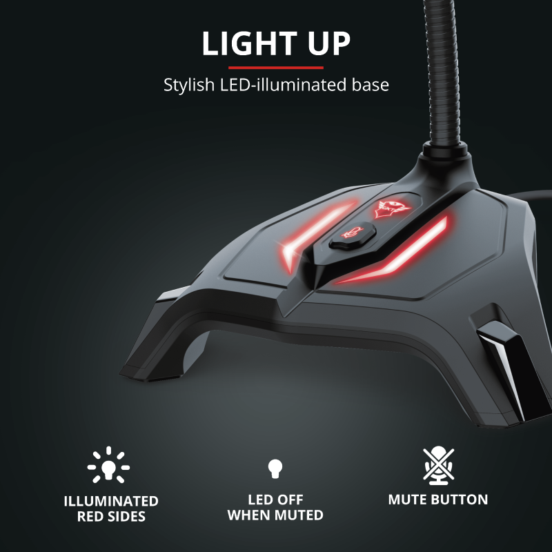 USB Gaming-Mikrofon mit LED-Beleuchtung und flexiblem Hals.Produkttext[/head]Kompaktes Gaming-MikrofonVerschaff dir Gehör bei deinen Followern und deinem Team. Das USB Gaming-Mikrofon Zabi mit LED-Beleuchtung ist ein praktisches Tischmikrofon, das deine Stimme einwandfrei erfasst und streamt. Jede Menge Funktionalität und Style im kompakten Format: Dieses Mikrofon wartet mit einigen praktischen Designdetails auf, die Aufnahmen, Streaming und Gespräche zum Kinderspiel machen.Kinderleichte KommunikationGanz gleich, ob du neuen Content aufzeichnen, dein Team beim Gaming dirigieren oder Online-Meetings veranstalten möchtest: Das Zabi wird allen deinen Anforderungen gerecht. Wenn du beim Sprechen viel gestikulierst, sorgt die LED-beleuchtete, rutschfeste Unterseite für Stabilität, und falls du mal eine Atempause einlegen möchtest, ist die Stummschalttaste leicht erreichbar.Smarte FunktionenDas Zabi besitzt alle Funktionen, die du von einem Tischmikrofon erwartest, und lässt sich super einfach bedienen. Sein flexibler Hals kann in jede Position gebogen werden, damit du beim Chatten immer so sitzen kannst, wie es für dich gerade am bequemsten ist. Und dank des 1,4 m langen USB-Kabels kannst du es an einem beliebigen Platz auf deinem Schreibtisch aufstellen. Die LED-Leuchte auf der Taste zeigt an, wann man dich hören kann: Sie leuchtet, wenn das Mikrofon aktiv ist, und erlischt, wenn du es stummschaltest.[head]Hauptmerkmale