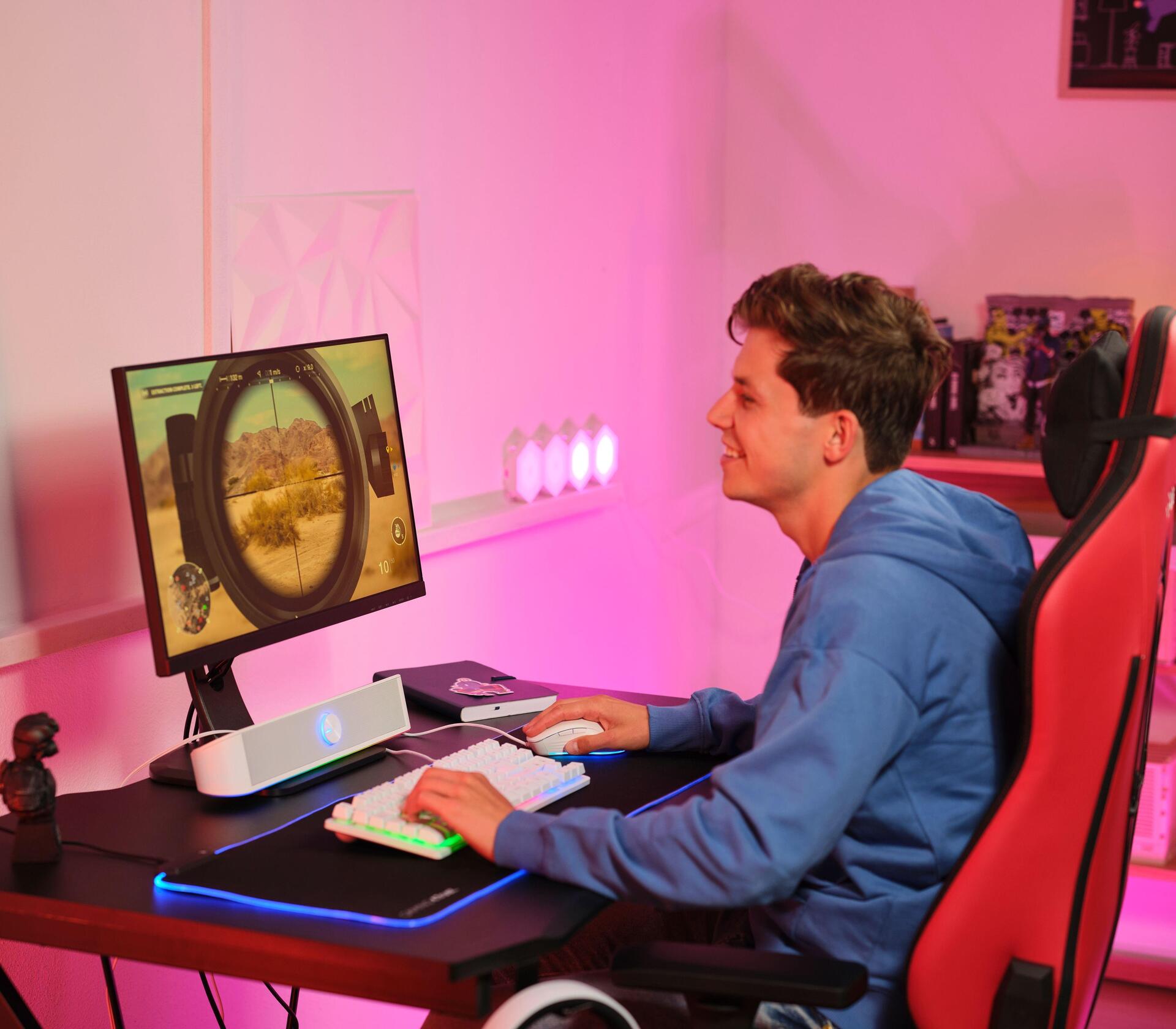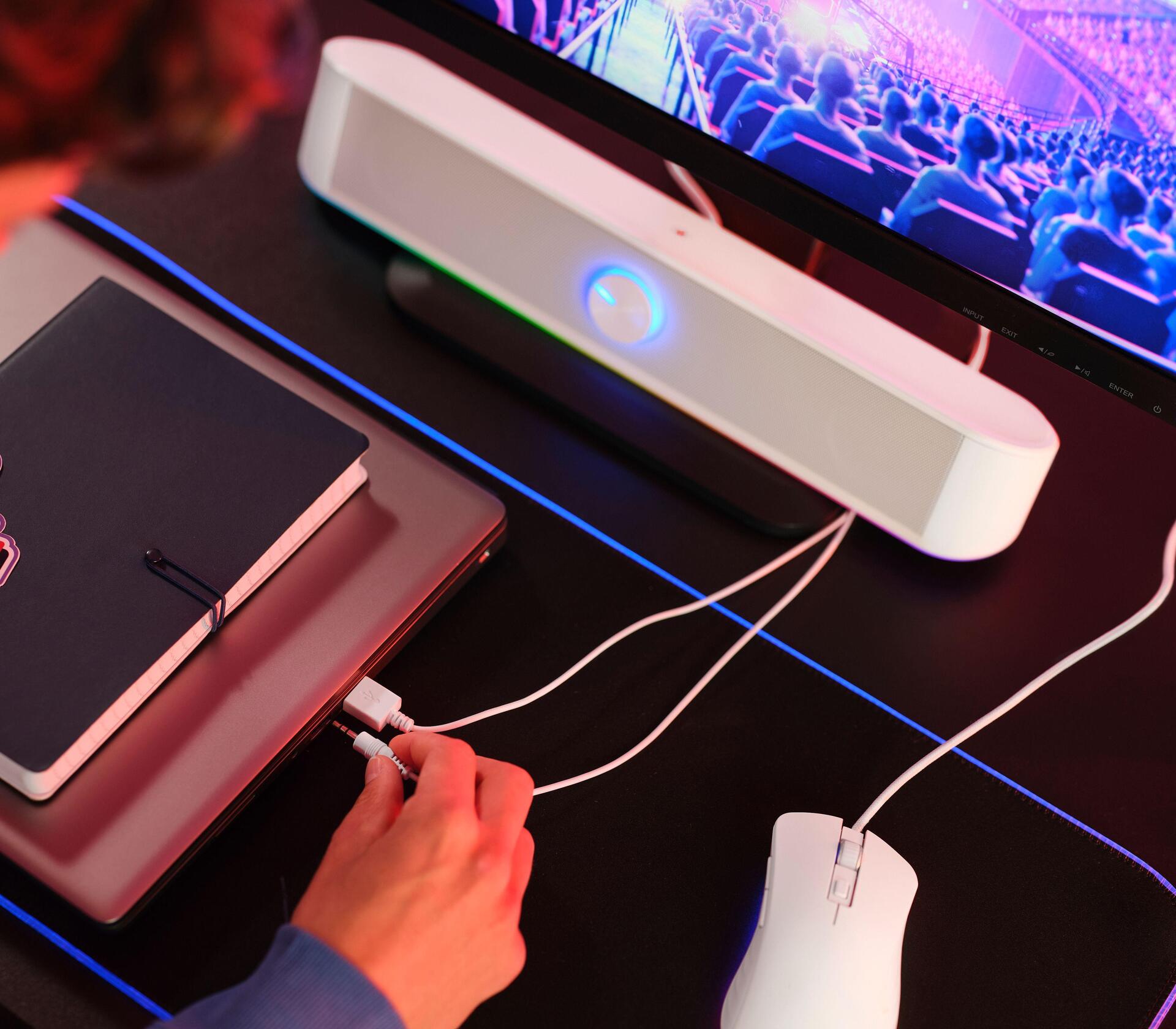 Die Trust GXT 619W Thorne Soundbar wurde entwickelt, um Ihr TV- oder Monitor-Audioerlebnis zu verbessern. Mit ihrer aktiven Verstärkung und dem integrierten Verstärker liefert diese Soundbar eine leistungsstarke Soundausgabe von 6 W RMS, unterstützt von einer Spitzenleistung von 12 W. Die beiden Vollbereichstreiber sorgen für einen satten Stereoklang, der Ihre Lieblingssendungen und -spiele zum Leben erweckt. Die Soundbar verfügt außerdem über eine RGB-Beleuchtung, die Ihrer Einrichtung ein elegantes Flair verleiht. Das kompakte Design aus strapazierfähigem ABS-Kunststoff passt perfekt unter jeden Monitor oder Fernseher, während die kabelgebundenen Anschlüsse und das 1,4 m lange Kabel eine einfache und unkomplizierte Einrichtung ermöglichen. Mit Bedienelementen für LED-Licht, Strom und Lautstärke kombiniert die Trust GXT 619W Thorne Soundbar Funktionalität mit Komfort und ist damit eine perfekte Ergänzung für jedes Unterhaltungssystem oder Gaming-Setup.