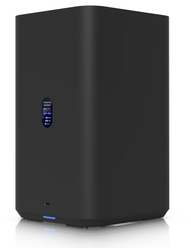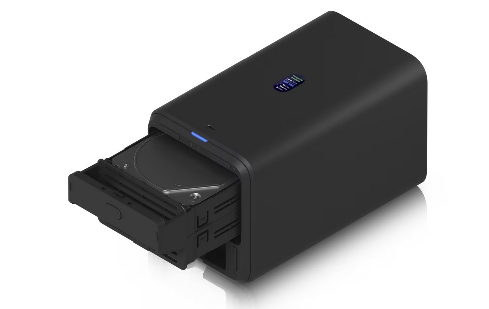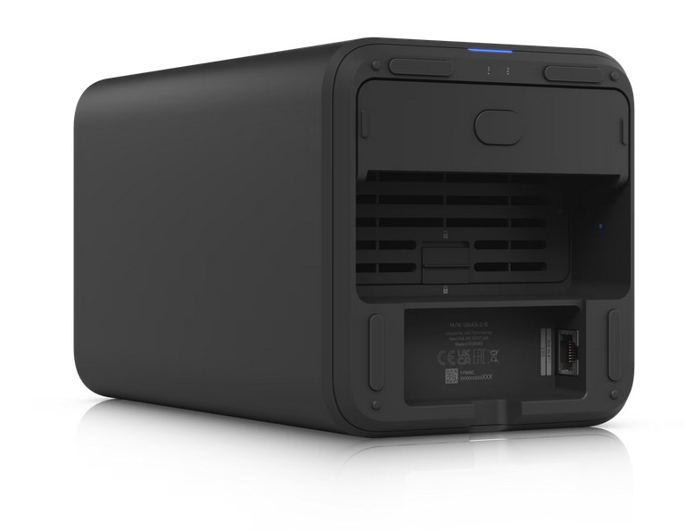 Das UniFi Network Attached Storage bietet zwei Einschübe für 2,5\"/3,5\" HDDs, zwei M.2 NVMe SSD-Steckplätze für Caching, 2.5-GbE-Konnektivität und einen USB-C-Anschluss. Es wird mit einem PoE++ Adapter geliefert und überzeugt durch ein kompaktes Design für platzsparende, leistungsfähige Netzwerkspeicherlösungen im UniFi-Ökosystem