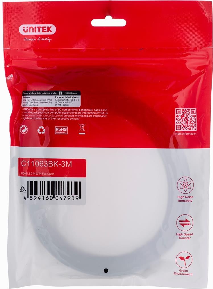 • UNITEK HDMI CABLE 2.0 4K60HZ FLAT 3M C11063BK-3M HDMI-Kabel 3 m HDMI Typ A (Standard) Schwarz (C11063BK-3M)