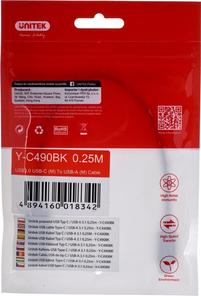 • UNITEK KABEL USB-C - USB-A 3.1,M/M,0,25M, Y-C490BK (Y-C490BK)