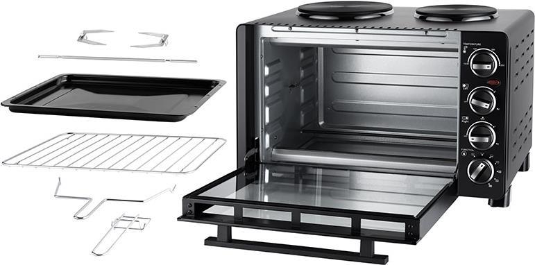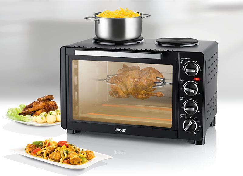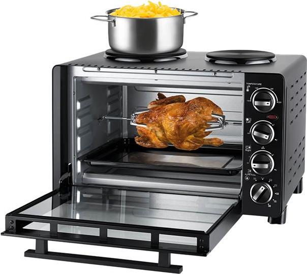 Das hitzeisolierte Außengehäuse sorgt - gemäß der EU-Norm - ebenso für Energieeinsparung wie die doppelverglaste Tür. Die Kompaktküche wird von umfangreichem Zubehör begleitet. Grillrost und Grillrostheber sowie ein Backblech gibt es; der Drehspieß mit Halteklammern für Hähnchen oder Spießbraten gehört ebenfalls zum Standard. Und die Bedienungsanleitung liefert leckere Rezeptideen frei Haus mit!