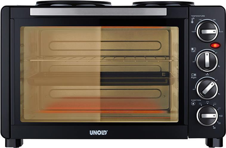 Auf den Kochplatten können Töpfe und Pfannen mit circa 18,5 und circa 14,5 cm eingesetzt werden, im Ofen ist Platz für Pizza- und Backformen mit circa 25 cm. Mit der einstellbaren Ofentemperatur von 100°C bis 220°C ist vom Gratinieren bis zu krosser Pizza alles möglich. Wahlweise mit der Kombi aus Ober-/Unterhitze oder separat einstellbar.