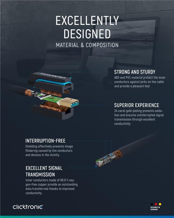 Übertragen Sie Daten von mobilen Festplatten, einem Scanner, dem Drucker oder einem anderen Peripheriegerät. USB 2.0 ermöglicht eine Übertragungsgeschwindigkeit von bis zu 480 Megabit pro Sekunde und ist die seit Jahren etablierte Schnittstelle. Dank zweifacher Signalschirmung, reiner Materialien und präziser Verarbeitung überträgt dieses Kabel Ihre Daten verlustfrei bis ins Ziel.