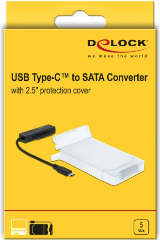 Dieser Konverter von Delock kann via USB-C Schnittstelle an einen PC oder Notebook angeschlossen werden. Somit lässt sich daran eine 2.5" SATA HDD oder SSD mit einer 22 Pin SATA Schnittstelle betreiben.