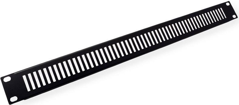 19"-Blindplatte mit Belüftungsschlitzen, lackiert in RAL 9005 (schwarz), zum Abdecken nicht benötigter Einbauplätze 19"-Blindblende mit einer Höheneinheit (1HE) und Belüftungsschlitzen RAL 9005 Lackierung, schwarz Zum Einsatz in 19" Serverschränken, um nicht benötigte Einbauplätze zu verdecken Metall.