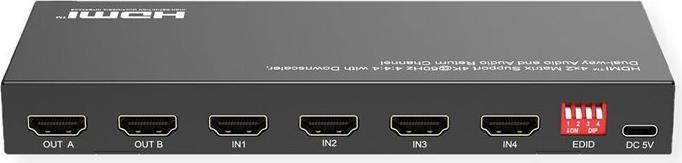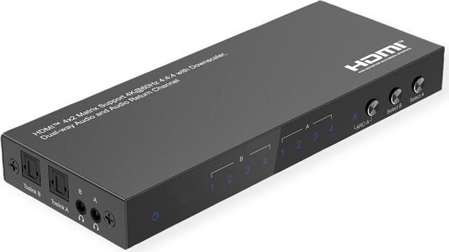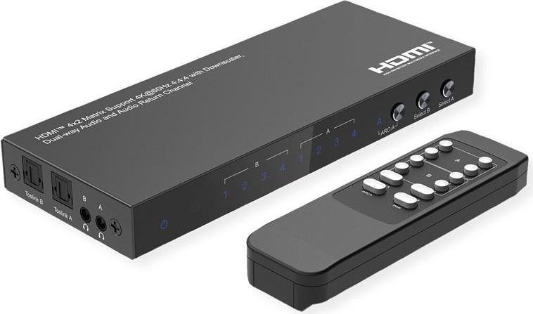 Mit dieser VALUE Matrix können Video-Inhalte aus vier angeschlossenen HDMI-Quellen beliebig auf zwei verschiedene Displays (Monitore, Projektoren, etc.) mit einer Auflösung von bis zu 4K60Hz ausgegeben werden.Die Matrix verfügt über eine LED-Leuchte auf der Vorderseite für eine einfache Statusüberwachung und eine drahtlose IR-Steuerung für eine bequeme Steuerung aus der Ferne. Ideal für den Anschluss und das Umschalten mehrerer Quellen in Rechenzentren, Helpdesks, Videoübertragungseinrichtungen sowie für Digital-Signage-Anwendungen in Einzelhandelsumgebungen. Vier Video-Eingänge (PCs, DVD-Player, Sat-Receiver, Blu-Ray-Player o.Ä.) werden auf zwei Video-Ausgänge (Monitore, TVs oder Projektoren) geswitcht bzw. gesplittet Die Installation ist einfach - keine Software, nur Kabel anschließen Audio-Ausgänge: 2x Toslink/SPDIF, 2x Stereo-Cinch Unterstützt Ultra HD 4K@60Hz Max. Auflösung (nominell): 4K @60Hz EDID-Kontrollfunktion Unterstützt HDCP 2.2 und HDCP 1.4 Umschalten zwischen den Eingabegeräten per IR Fernbedienung oder direkt über Taster am Switch Unterstützt Blu-ray, UHD-Blu-ray, Satelliten-Receiver, Spielekonsolen, PCs usw. Unterstützte komprimiertes Audio wie DTS, Dolby Digital (einschließlich DTS-HD Master Audio und Dolby TrueHD) Zweiwege-Audioextraktion für Ausgang A und Ausgang B Downscale-Funktion: Die Matrix kann die 4K-Eingangsauflösung auf 1080p für FHD (1080p)-Displays und 4K-Auflösung für 4K-Displays im 1x4-Splittermodus gleichzeitig herunterskalieren. Schwarzes Metallgehäuse.