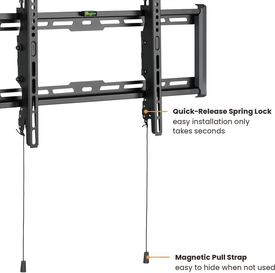 Stabile und neigbare TV-Wandhalterung mit gerade mal 47 mm Wandabstand • Für Bildschirme von 37" bis 80" (max. VESA 600x400) • Tragkraft von bis zu 75 kg • Neigbare Aufhängung • Sehr geringer Wandabstand von 47 mm • Sicherung gegen unbeabsichtigtes Lösen der Montagehaken • Integrierte Wasserwaage.