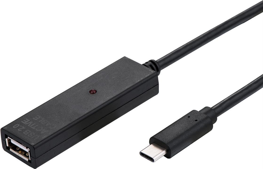 Aktives USB 2.0 Verlängerungskabel mit Typ C Stecker und Typ A Buchse zur Verbindung beispielsweise eines MacBooks/Ultrabooks mit einer externen Festplatte (SSD/HDD) oder einem Drucker über größere Distanz.