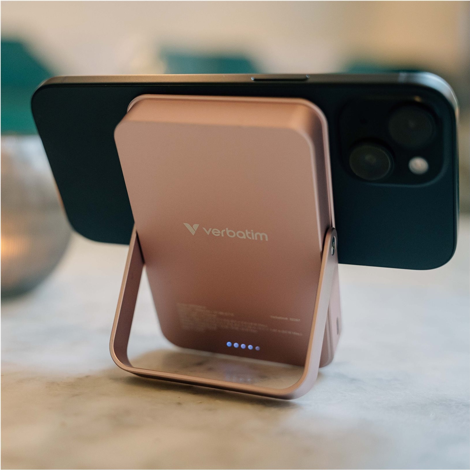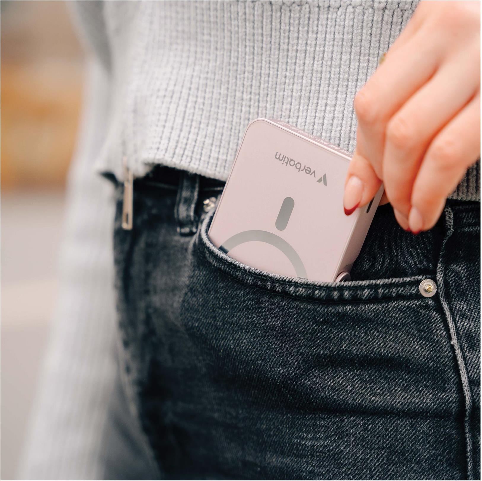Die kabellose Powerbank "Charge 'n' Go" von Verbatim ist eine vielseitige Ladelösung, mit der Sie Ihre Geräte auch unterwegs mit Strom versorgen können. Mit einer Kapazität von 10.000 mAh ist diese Powerbank über ihr USB-C-zu-USB-C-Kabel in der Lage, Tablets und Mobiltelefone schnell aufzuladen. Die magnetische Funktion sorgt für eine bequeme Befestigung, während der integrierte Ständer zusätzliche Funktionalität für die freihändige Nutzung bietet – ideal zum Betrachten während des Ladevorgangs.