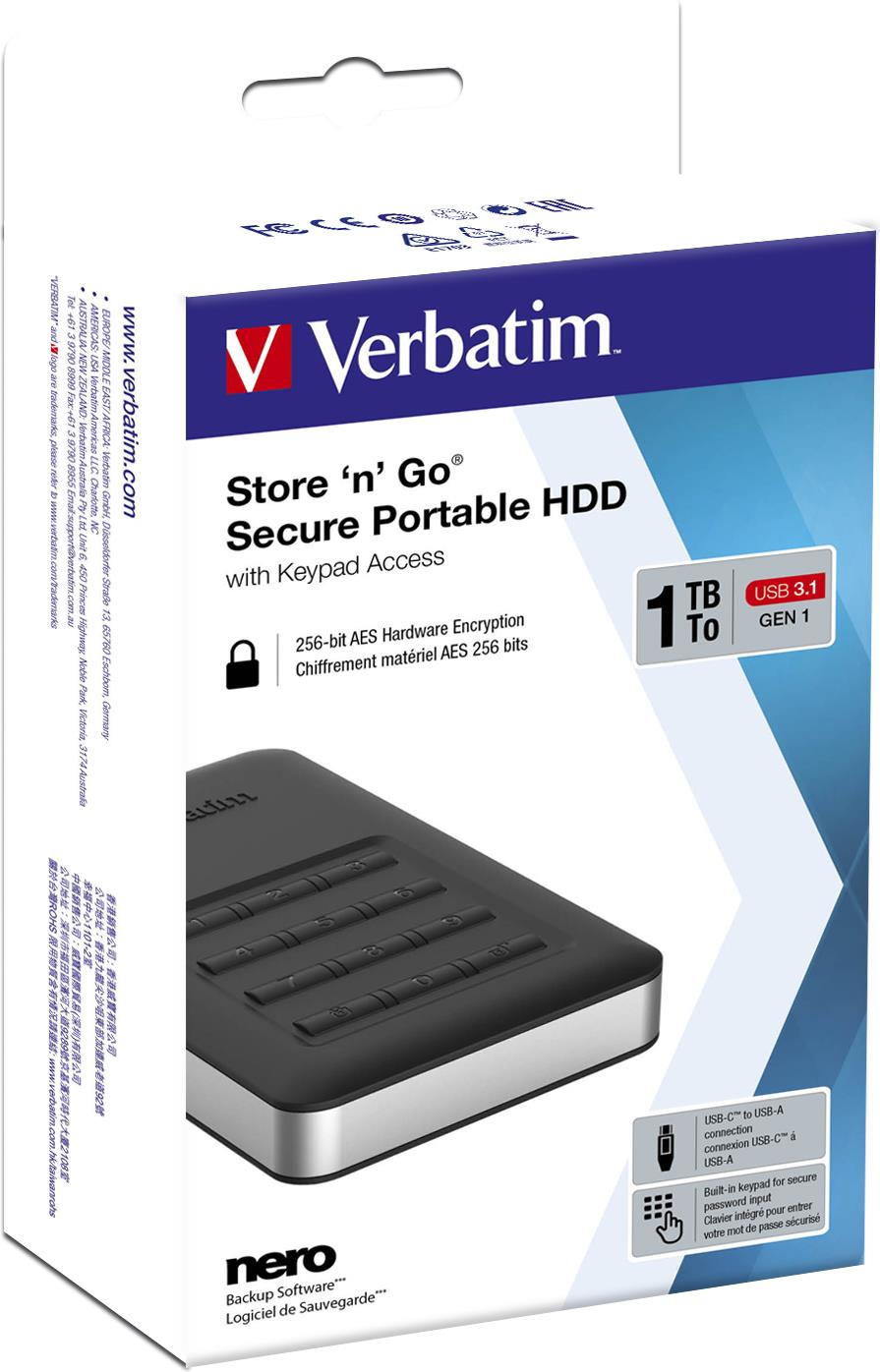 Verbatim Store 'n' Go Portable - Festplatte - verschlüsselt - 1 TB - extern (tragbar) - USB 3.1 Gen 1 (USB-C Steckverbinder) - 256-Bit-AES