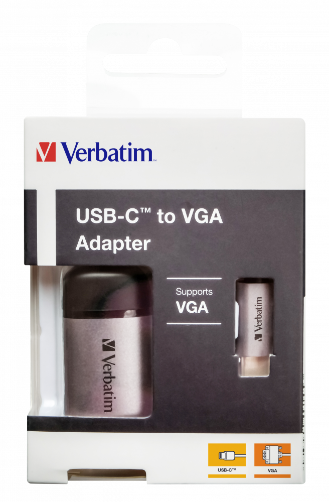 Der Verbatim USB-C auf VGA Adapter ermöglicht Ihnen das Anschließen Ihrer USB-C- oder Thunderbolt 3-fähigen (USB-C) Laptops und MacBooks an ein VGA-Display. Er ist der ideale Begleiter für die neuen Slimline-Laptops und MacBooks, die nur über begrenzte Anschlussmöglichkeiten verfügen. Sie müssen nicht gleich Ihr ganzes Setup austauschen, wenn Sie Ihrem Laptop ein Upgrade verpassen. Schließen Sie einfach den Adapter an einen USB-C-Anschluss an Ihrem Laptop an und stecken Sie dann den VGA-Stecker Ihres Fernsehers, Projektors oder Monitors ein.