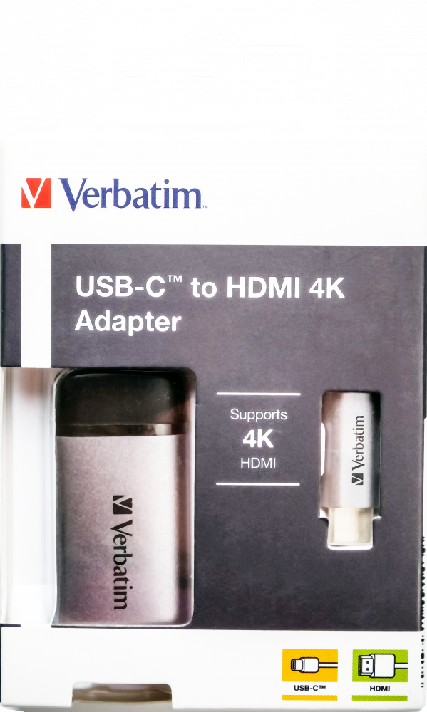 Der Verbatim USB-C auf HDMI 4K Adapter ermöglicht Ihnen das Anschließen Ihrer USB-C- oder Thunderbolt 3-fähigen (USB-C) Laptops und MacBooks an einen Projektor, HDTV oder Monitor, der HDMI unterstützt. Er ist der ideale Begleiter für die neuen Slimline-Laptops und MacBooks, die nur über begrenzte Anschlussmöglichkeiten verfügen. Sie müssen nicht gleich Ihr ganzes Setup austauschen, wenn Sie Ihrem Laptop ein Upgrade verpassen. Schließen Sie einfach den Adapter an einen USB-C-Anschluss an Ihrem Laptop an und stecken Sie dann ein HDMI-Kabel ein, um die Verbindung zu Ihrem Display herzustellen.Produkttext[/head]Nahtlose VerbindungDer Verbatim USB-C auf HDMI 4K Adapter ermöglicht Ihnen das Anschließen Ihrer USB-C- oder Thunderbolt 3-fähigen (USB-C) Laptops und MacBooks an einen Projektor, HDTV oder Monitor, der HDMI unterstützt. Er ist der ideale Begleiter für die neuen Slimline-Laptops und MacBooks, die nur über begrenzte Anschlussmöglichkeiten verfügen. Sie müssen nicht gleich Ihr ganzes Setup austauschen, wenn Sie Ihrem Laptop ein Upgrade verpassen. Schließen Sie einfach den Adapter an einen USB-C-Anschluss an Ihrem Laptop an und stecken Sie dann ein HDMI-Kabel ein, um die Verbindung zu Ihrem Display herzustellen.Ultra-HD-AuflösungDer USB-C auf HDMI 4K Adapter unterstützt messerscharfe Auflösungen bis Ultra HD 4K und bietet so reichhaltige Inhalte für das ultimative immersive Erlebnis. Selbst bei höheren Frame-Raten liefert der Adapter immer noch glatte Bilder ohne Datenverluste oder Aussetzer.Handlich und praktischDieses äußerst handliche Gerät eignet sich perfekt für BYOD-Anwendungen (Bring Your Own Device) im Büro und auf Reisen. Sie können Ihre Bildschirminhalte auf einen großen HDTV oder einen weiteren Monitor spiegeln oder erweitern, um darauf zu arbeiten, zu spielen oder sich bei einem echten 4K-Erlebnis zu entspannen.Der USB-C auf HDMI Adapter ermöglicht eine nahtlose Verbindung von jedem beliebigen USB-C-Gerät zu Ihrem Projektor, TV oder MonitorDie HDMI-Schnittstelle unterstützt bis zu 4K Videoübertragung von Ihrem Computer zu einem 4K-MonitorDas schlanke und kompakte Design macht dieses Gerät sehr mobil und zum perfekten Begleiter für unterwegs[head]Hauptmerkmale
