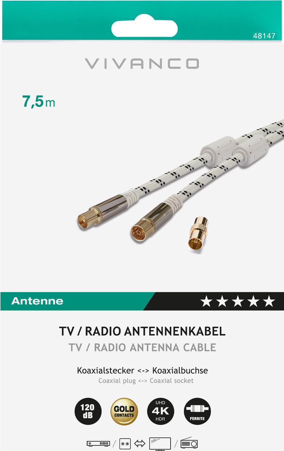 Vivanco Antennen Anschlusskabel [1x Antennenstecker 75 ? - 1x Antennenbuchse 75 ?] 7.50 m vergoldete Steckkontakte, vierfach geschirmt, mit Ferritkern Weiß (48147)