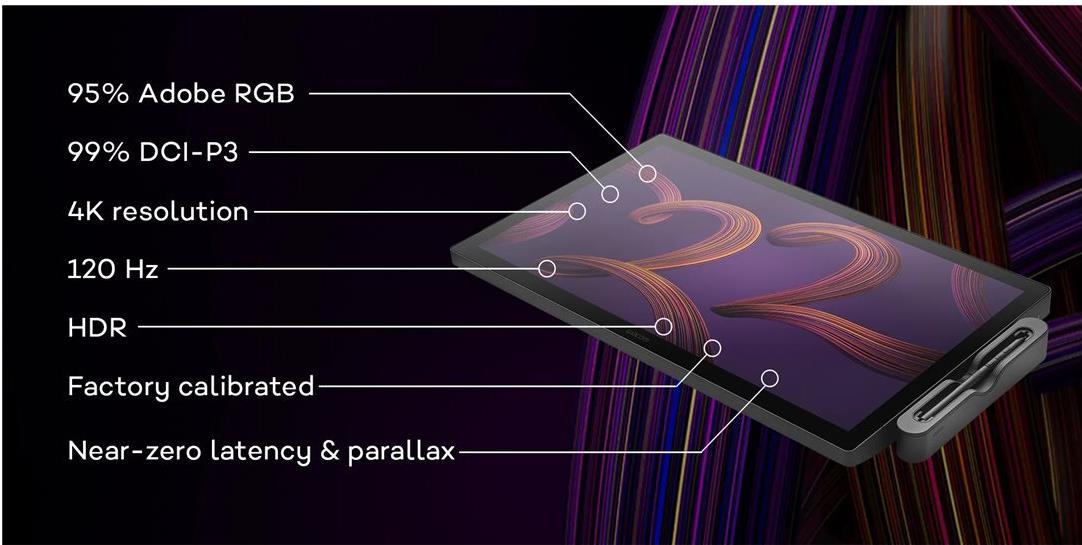 Leistungsmerkmale Druckempfindlicher Kugelschreiber, Neigungserkennung, batterielos, 95% Adobe RGB, 99 % DCi-P3, Tastverhältnis von 120 Hz, VESA 100 x 100 mm, Pantone Validated, HDR Gamma Support, 8 ExpressKeys
