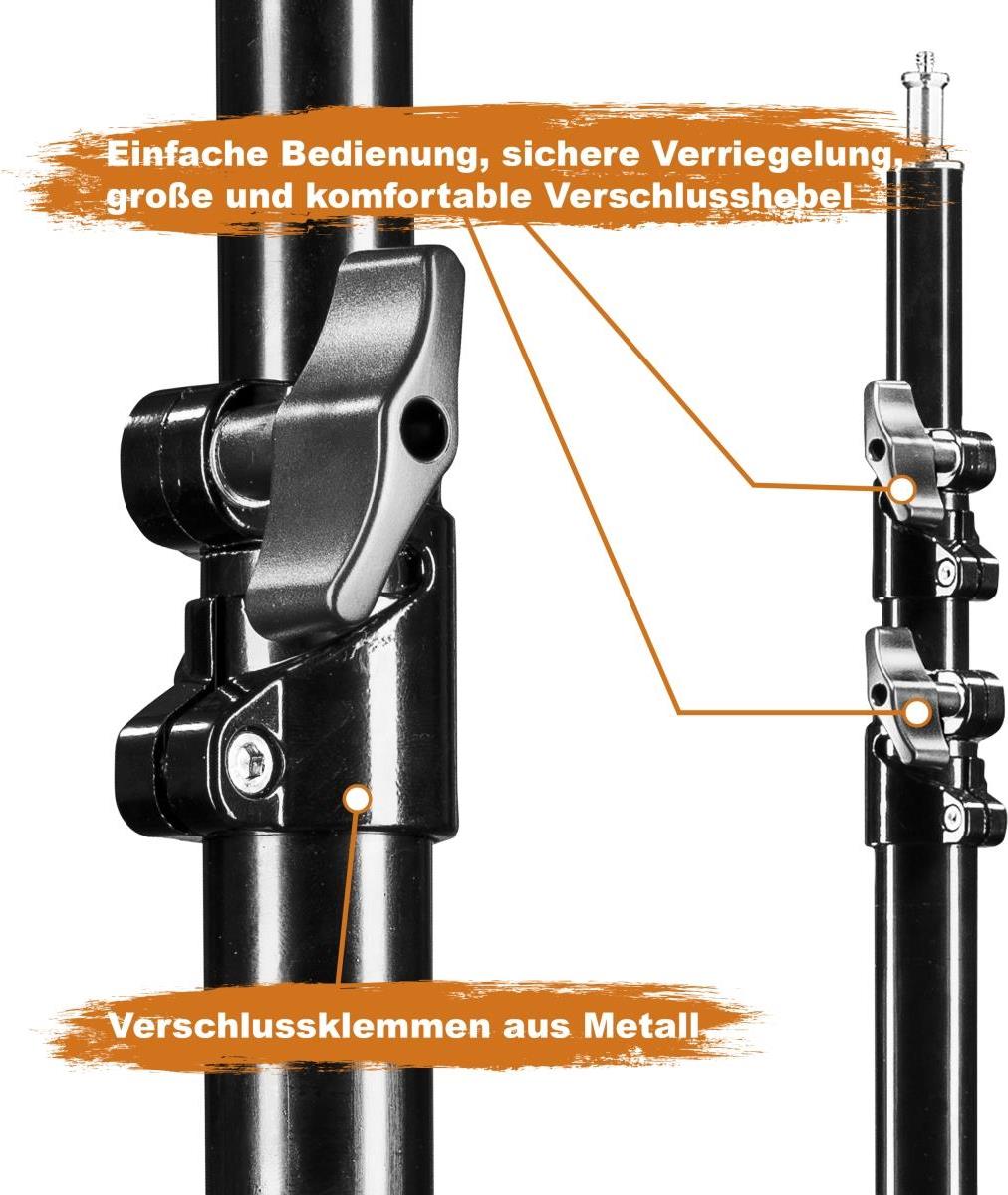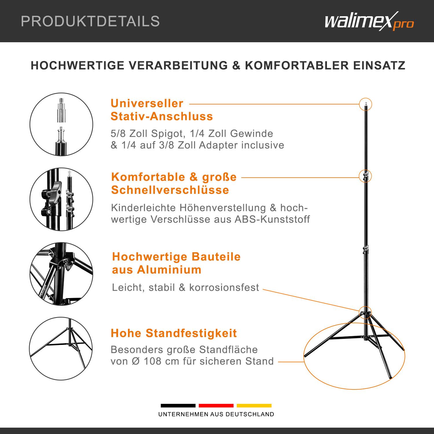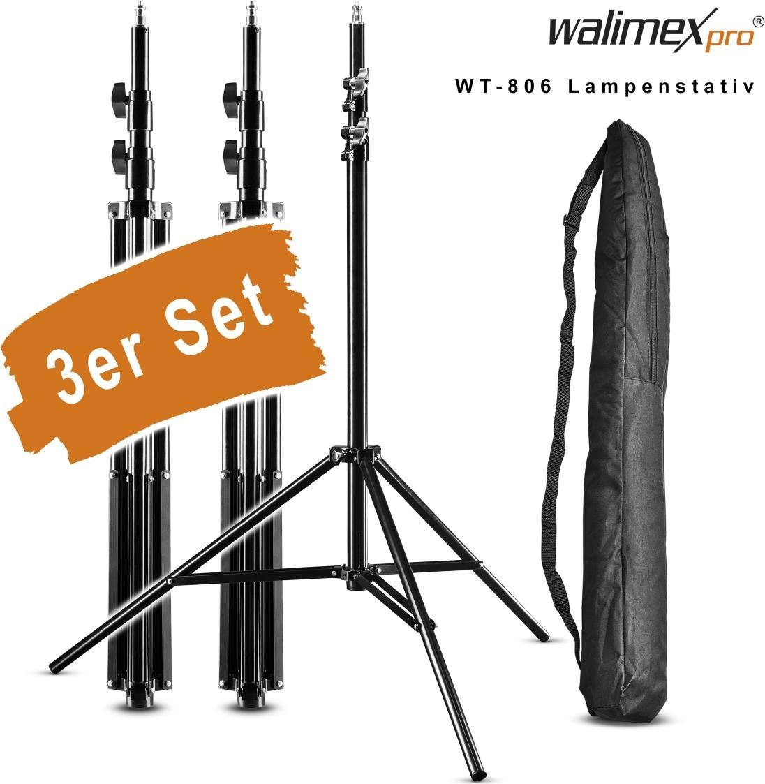 Walimex pro 3x Lampenstativ WT-806 mit Federdämpfung I Höhe max. 256cm I stabiles Lichtstativ belastbar bis 6kg I Beleuchtungsstativ für Ringlicht, Reflektor, Blitz & Video I 3/8" Adapter & 3 Taschen (1017698)