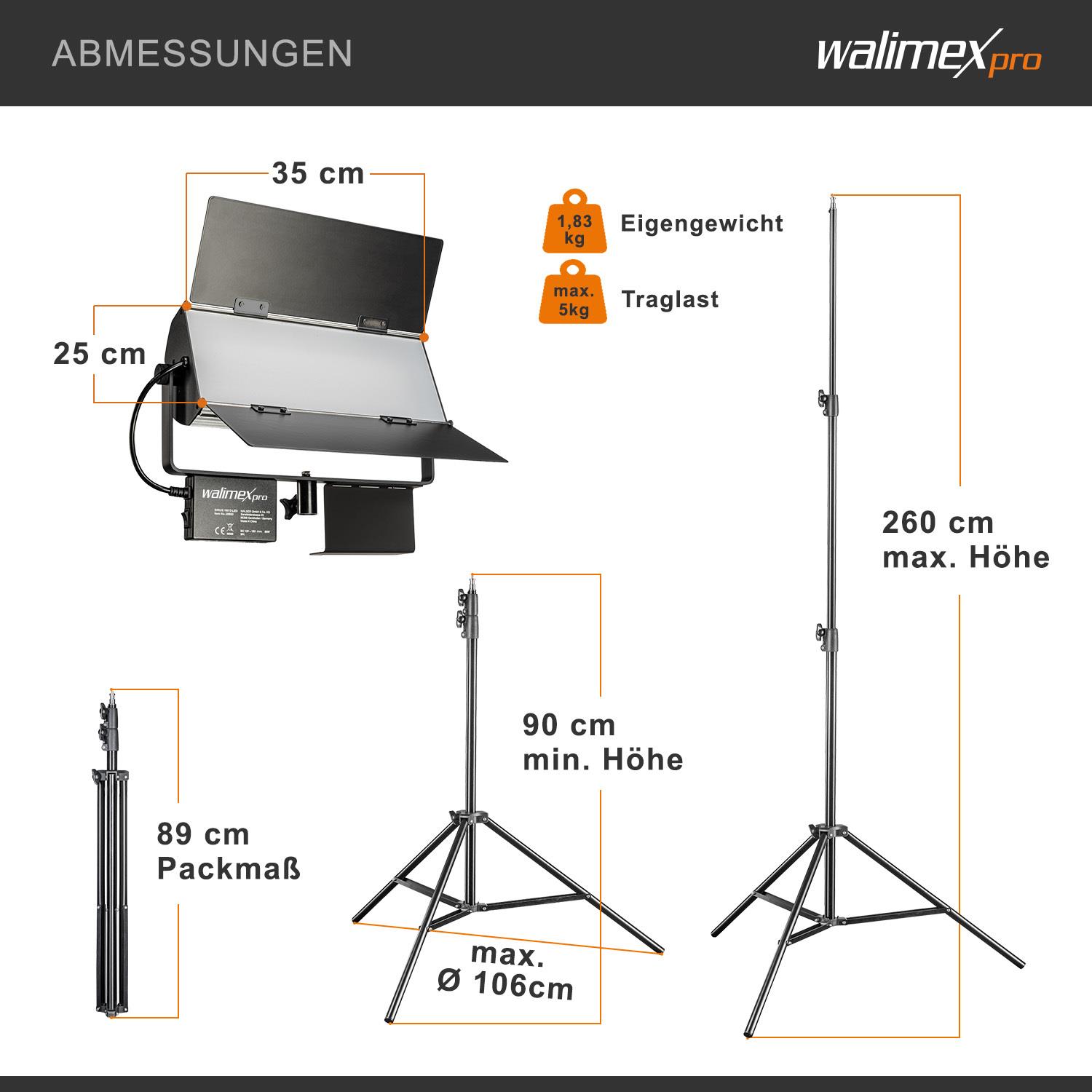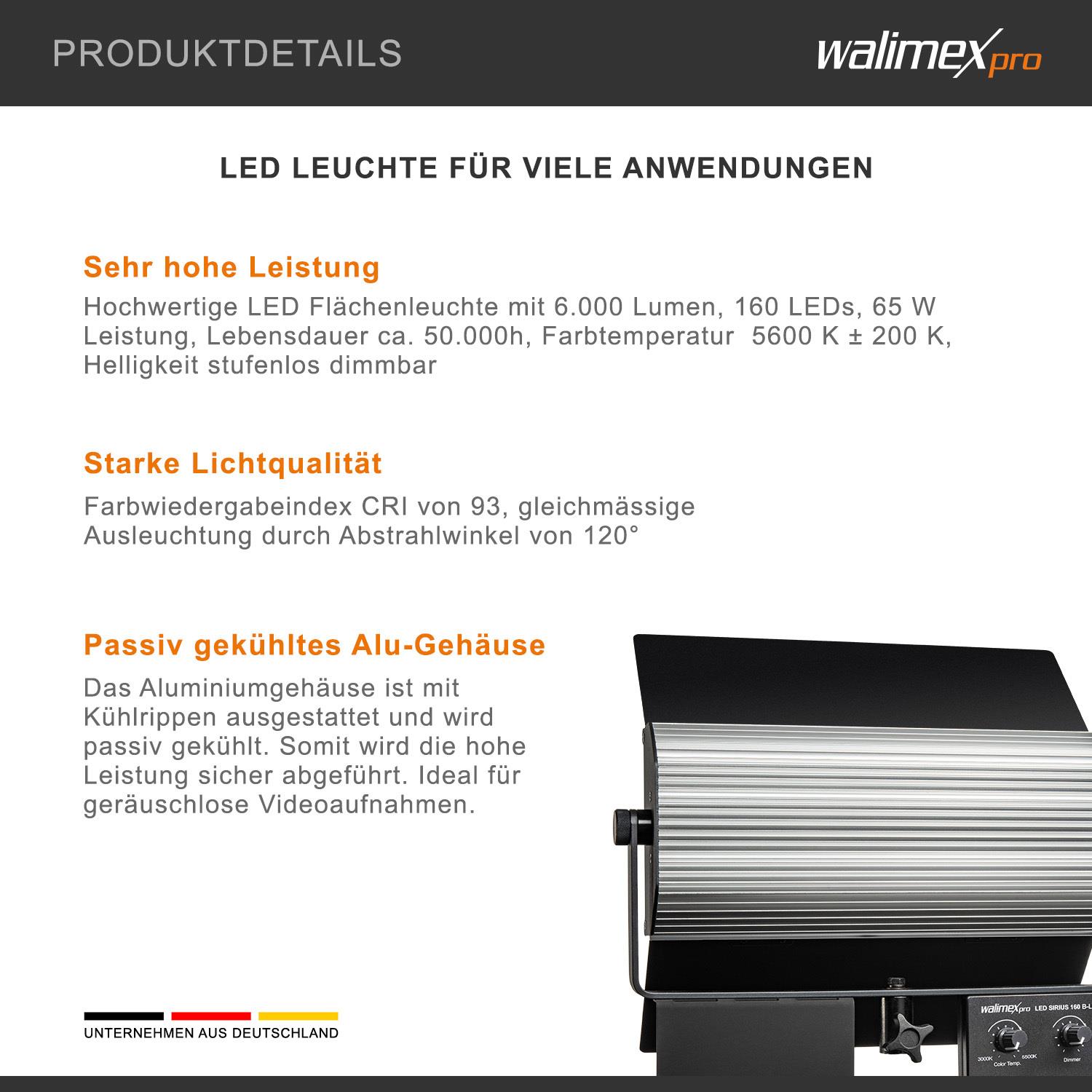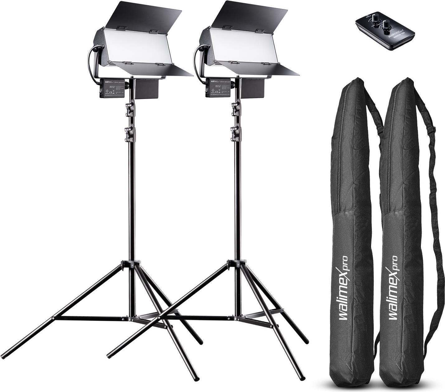 Walimex pro LED Sirius 160 Daylight 2er Set mit Stativ + Fernbedienung - 2x 65W Daylight Flächenleuchte, Studioleuchte, 2x 65 Watt 6000 Lumen, 5600K, für Foto + Video 21042 Weiß (1021042)